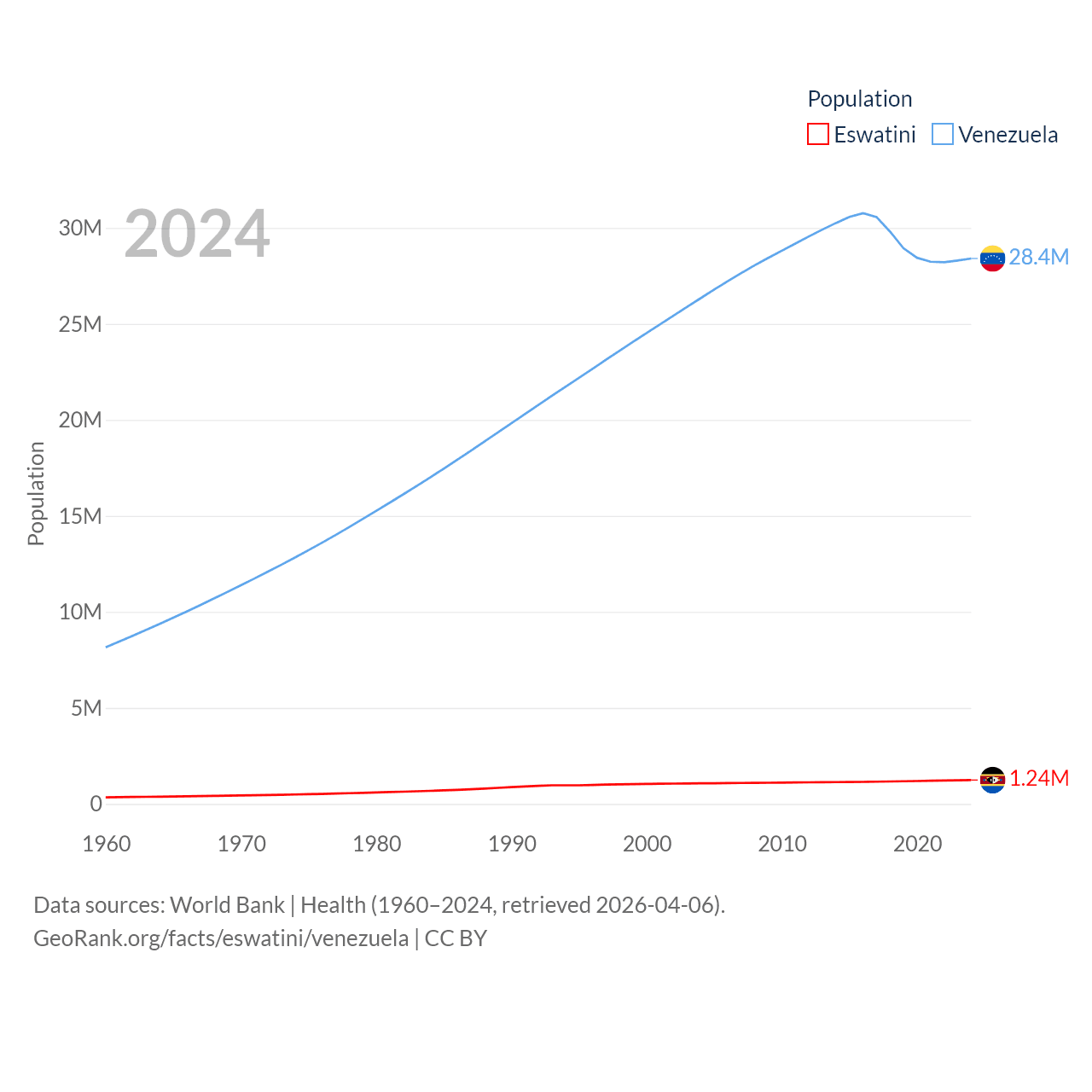 Eswatini has a population of 1.24M (ranked 157/197), compared with 28.4M in Venezuela (ranked 53/197). Eswatini's land area is 6,641 sq mi versus 340,561 sq mi for Venezuela (ranked 154th vs. 32nd).