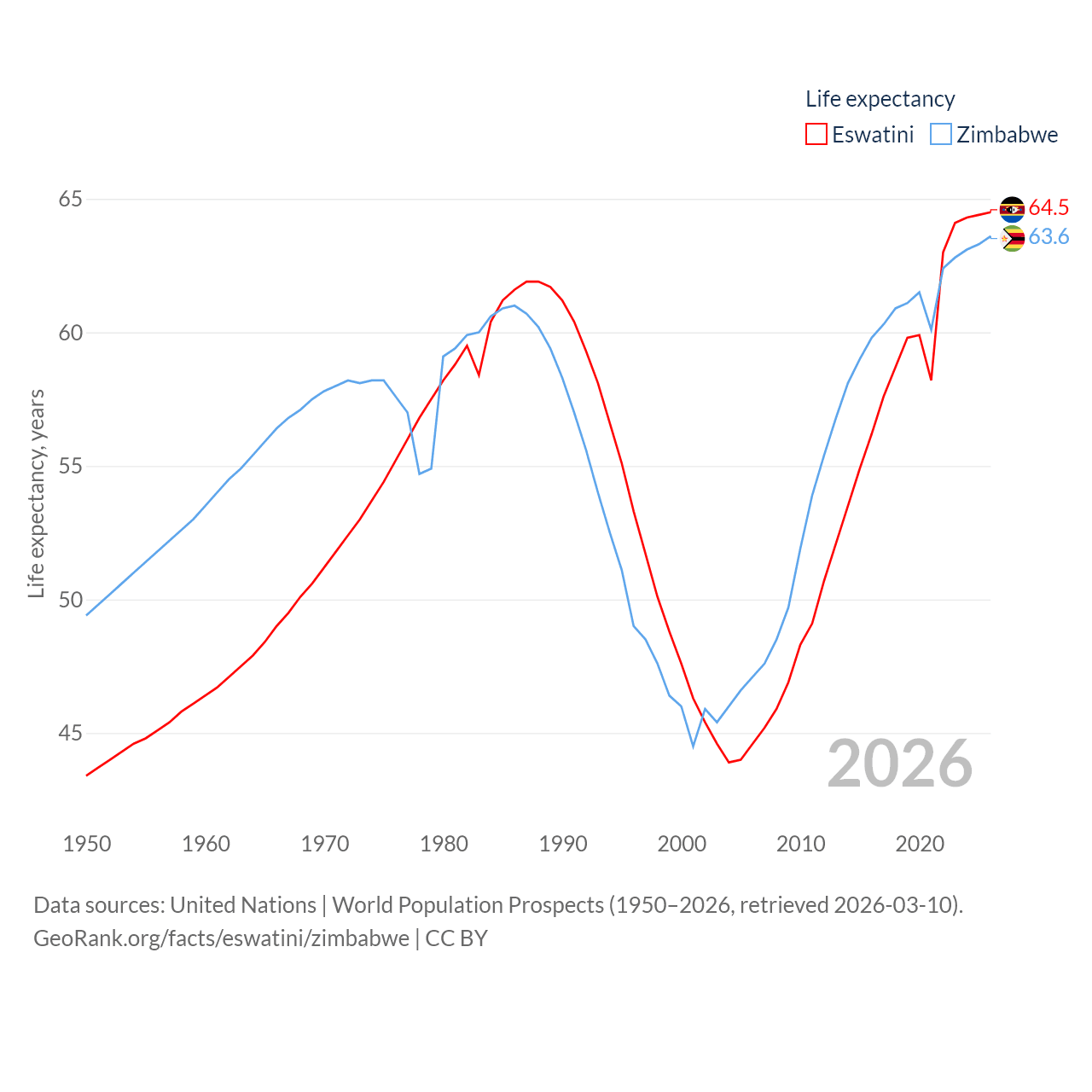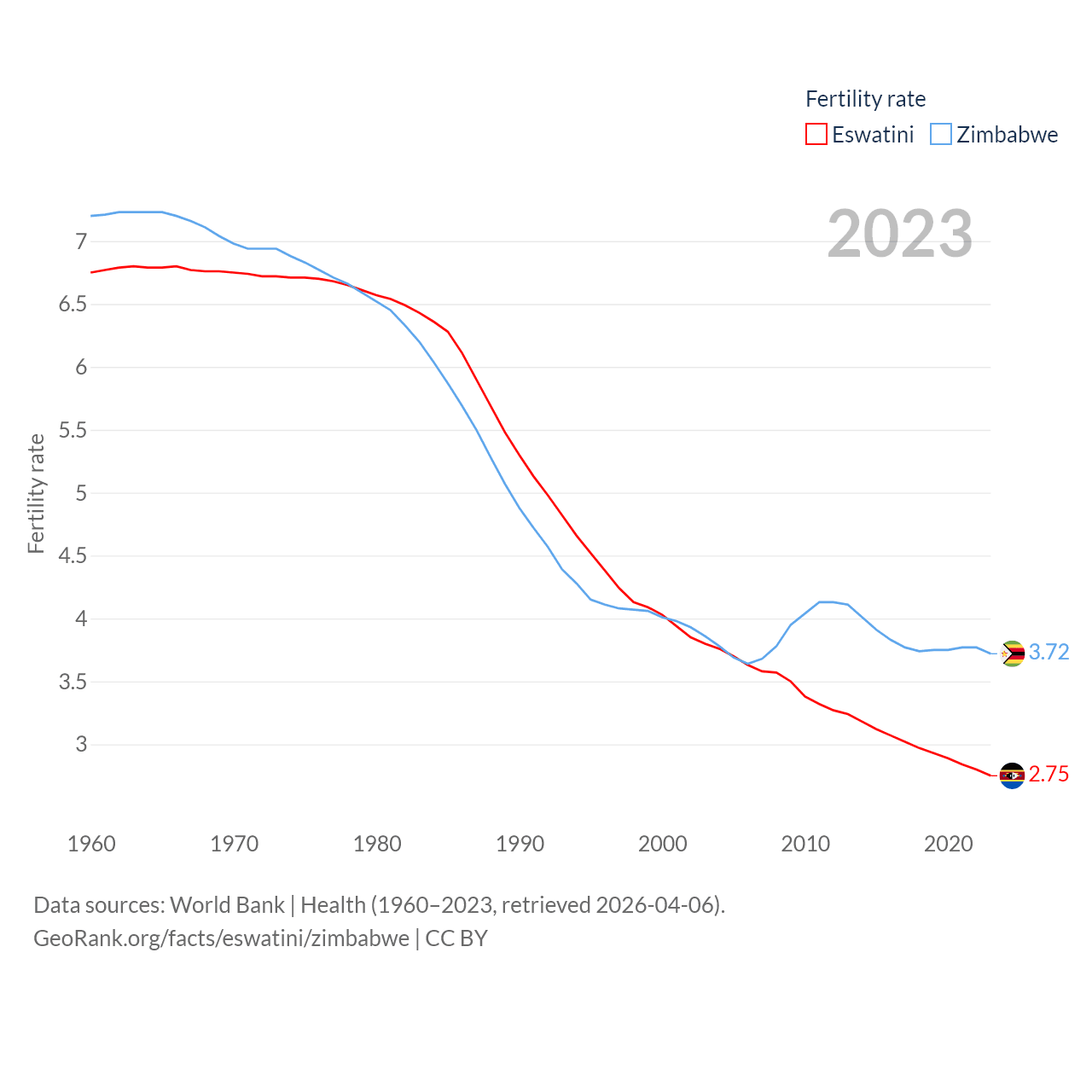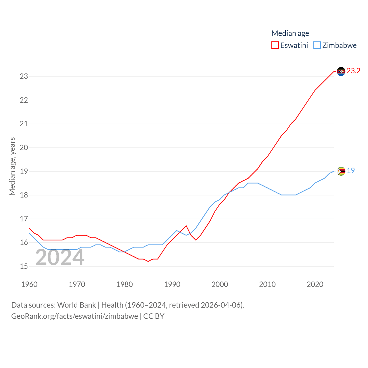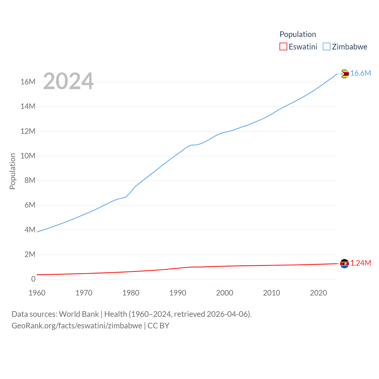 Eswatini has a population of 1.24M (ranked 157/197), compared with 16.6M in Zimbabwe (ranked 74/197). Eswatini's land area is 6,641 sq mi versus 149,364 sq mi for Zimbabwe (ranked 154th vs. 60th).