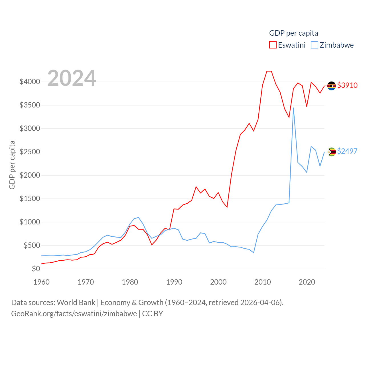 By GDP, Eswatini ranks 162/197 ($4.86B) and Zimbabwe ranks 102/197 ($41.5B). By GDP per capita, Eswatini ranks 131/197 ($3,910), while Zimbabwe ranks 148/197 ($2,497).