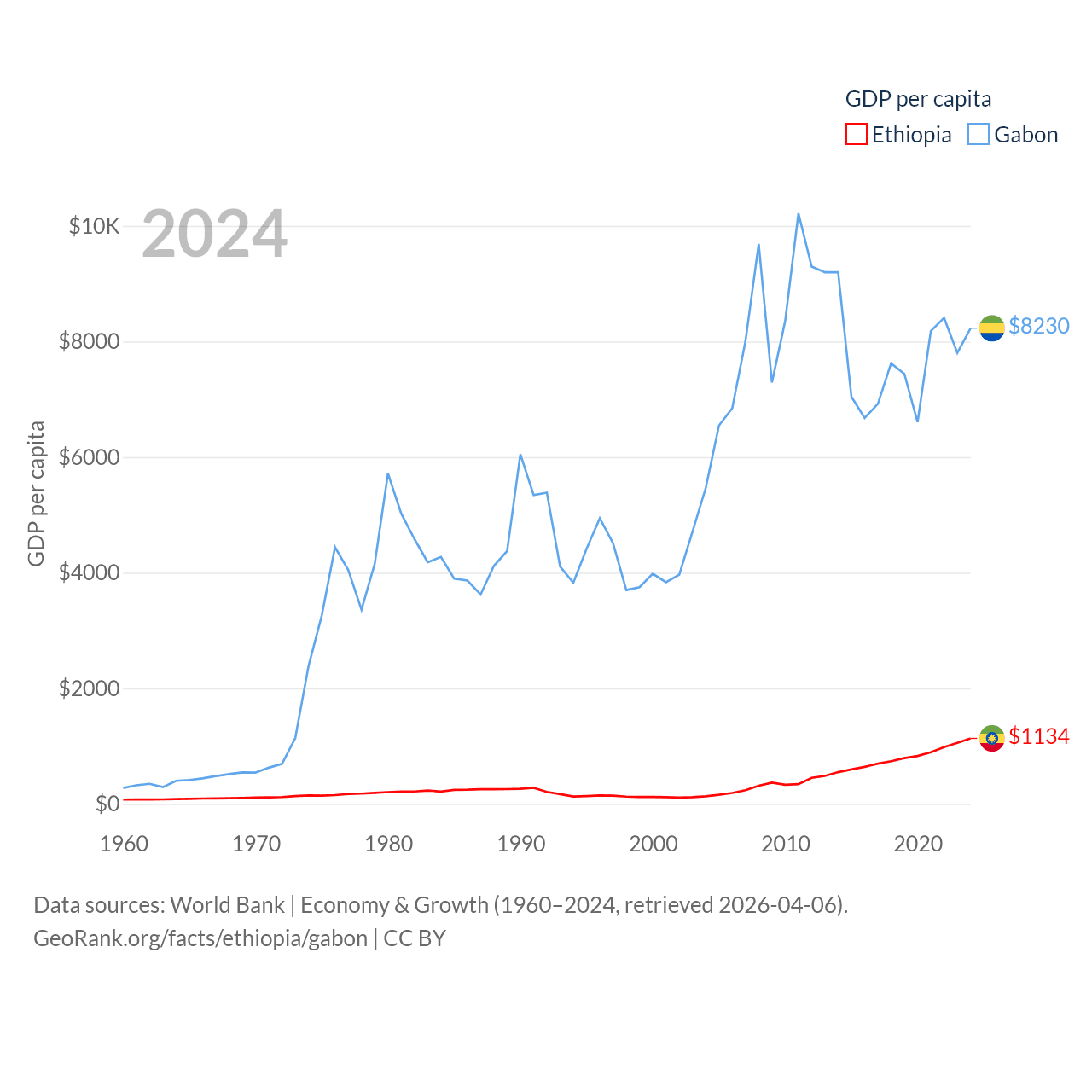 By GDP, Ethiopia ranks 60/197 ($150B) and Gabon ranks 127/197 ($20.9B). By GDP per capita, Ethiopia ranks 171/197 ($1,134), while Gabon ranks 93/197 ($8,230).