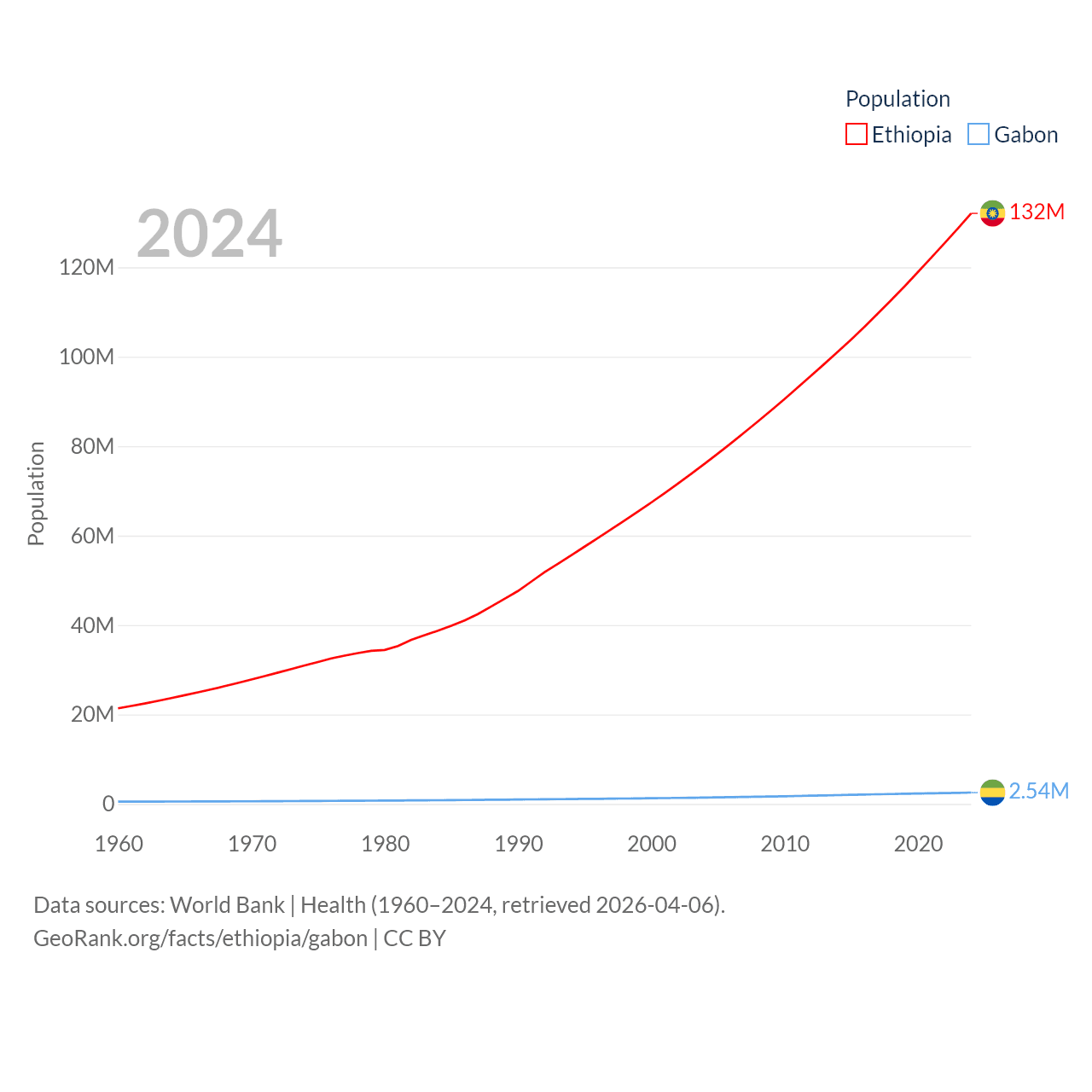 Ethiopia has a population of 132M (ranked 10/197), compared with 2.54M in Gabon (ranked 141/197). Ethiopia's land area is 435,716 sq mi versus 99,487 sq mi for Gabon (ranked 25th vs. 75th).