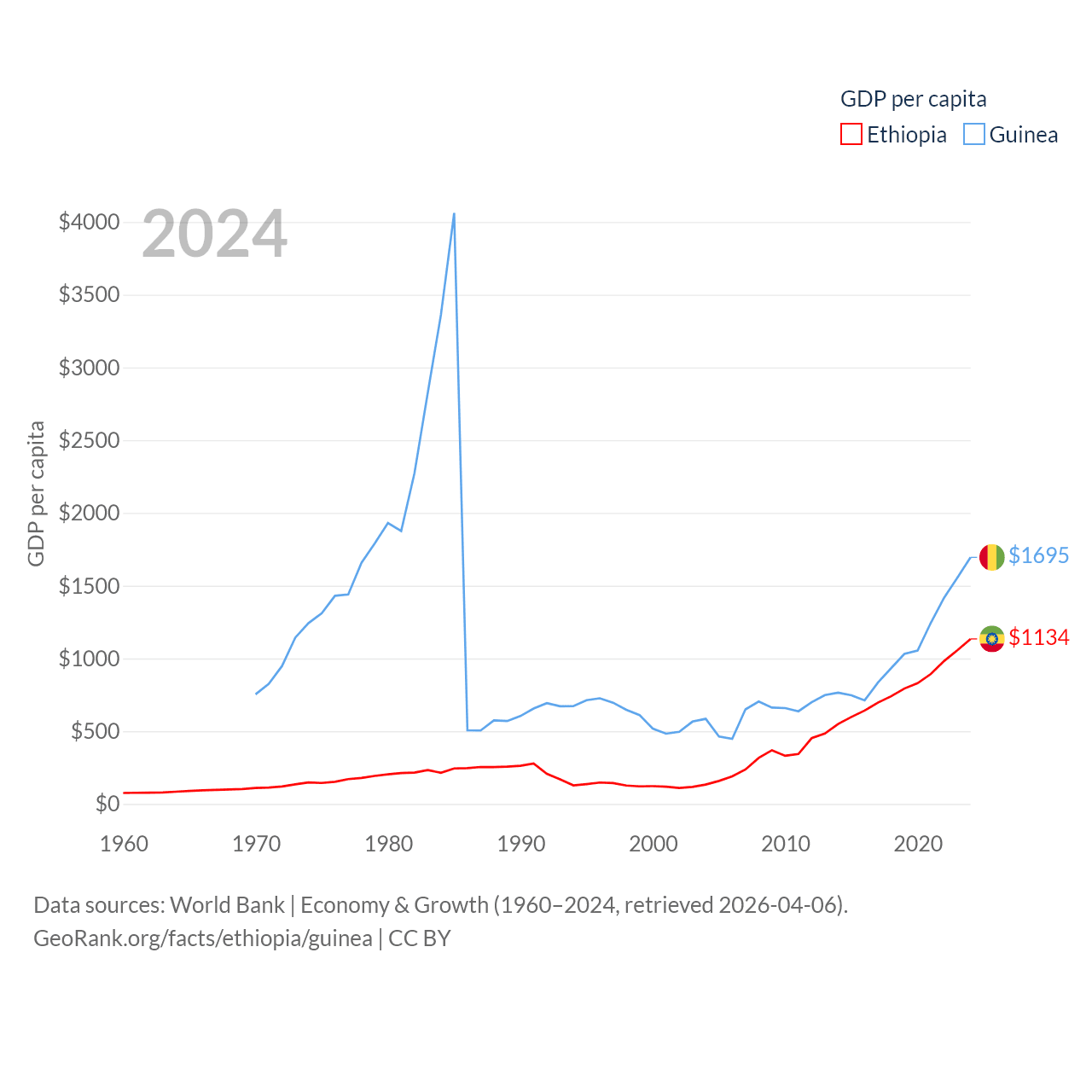 By GDP, Ethiopia ranks 60/197 ($150B) and Guinea ranks 118/197 ($25B). By GDP per capita, Ethiopia ranks 171/197 ($1,134), while Guinea ranks 160/197 ($1,695).