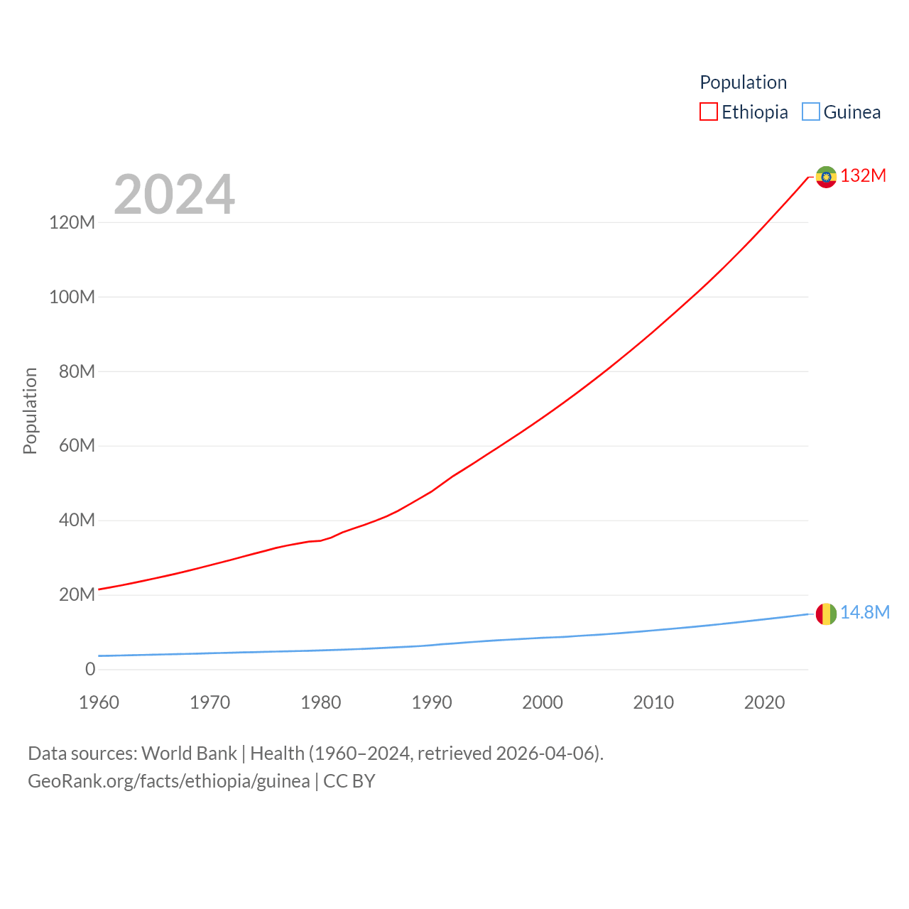 Ethiopia has a population of 132M (ranked 10/197), compared with 14.8M in Guinea (ranked 75/197). Ethiopia's land area is 435,716 sq mi versus 94,873 sq mi for Guinea (ranked 25th vs. 77th).