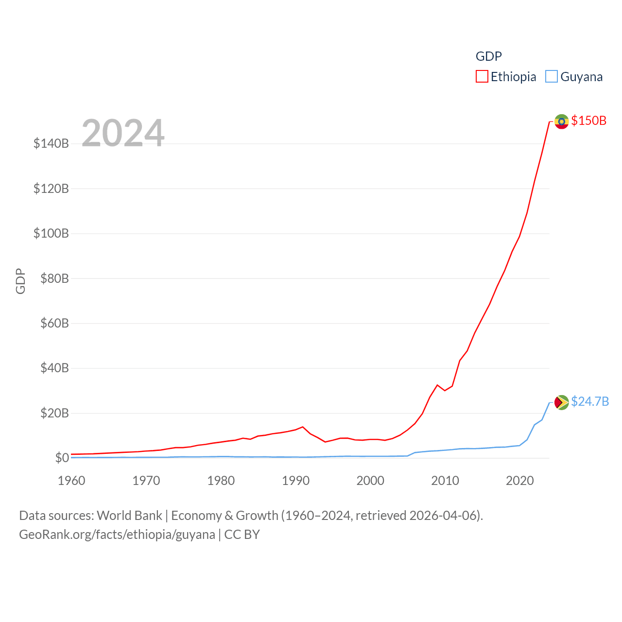 By GDP, Ethiopia ranks 60/197 ($150B) and Guyana ranks 120/197 ($24.7B). By GDP per capita, Ethiopia ranks 171/197 ($1,134), while Guyana ranks 41/197 ($29,675).