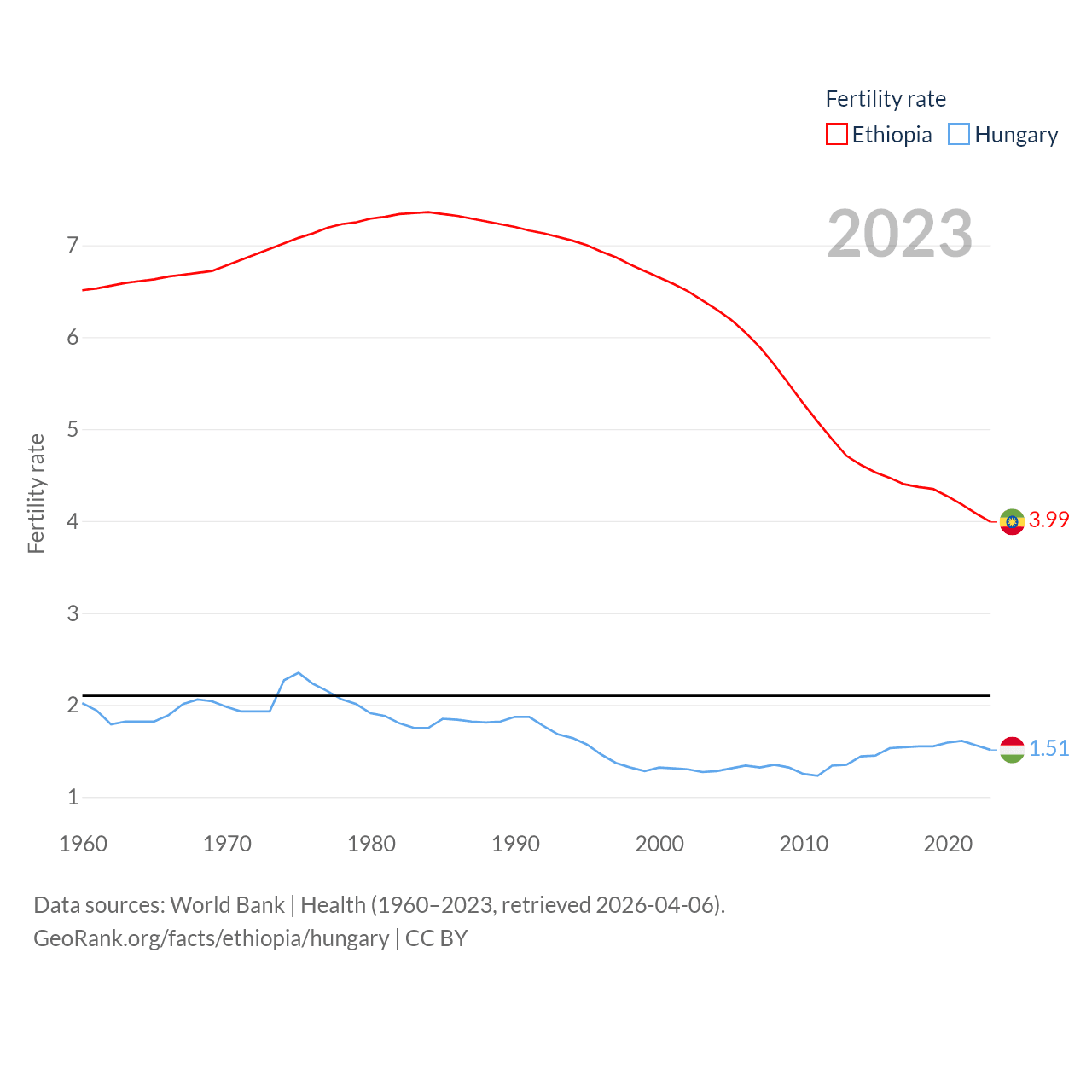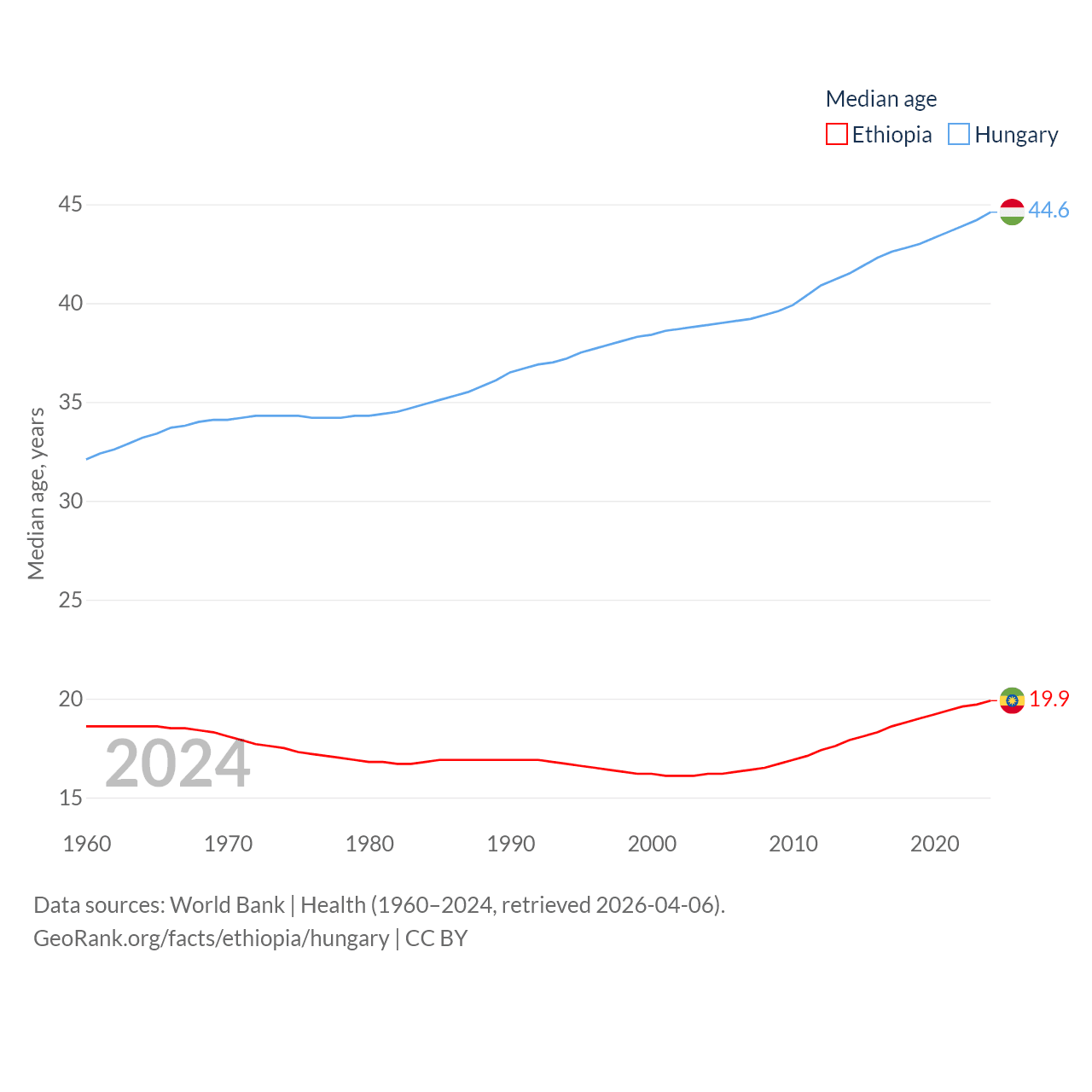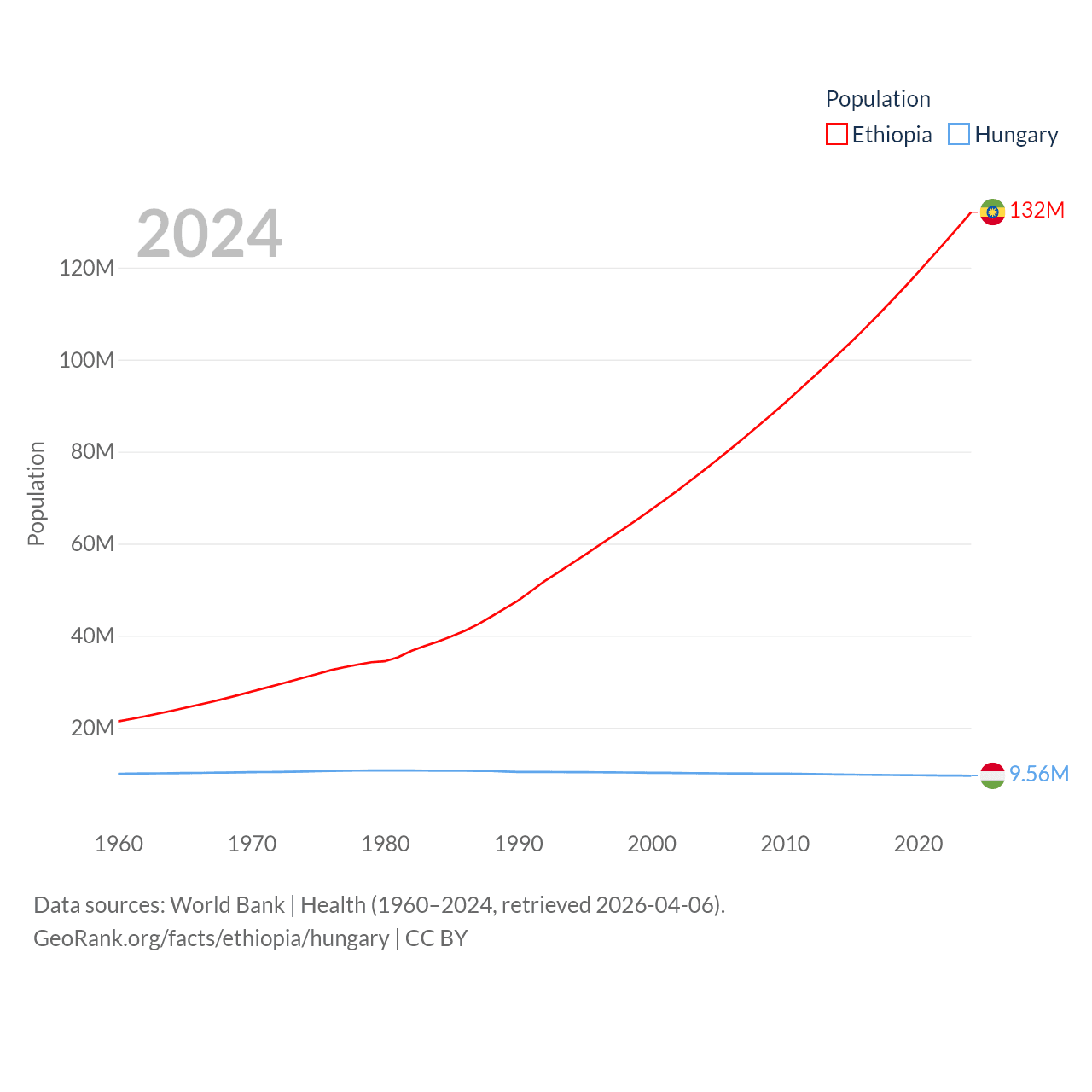 Ethiopia has a population of 132M (ranked 10/197), compared with 9.56M in Hungary (ranked 97/197). Ethiopia's land area is 435,716 sq mi versus 35,236 sq mi for Hungary (ranked 25th vs. 109th).
