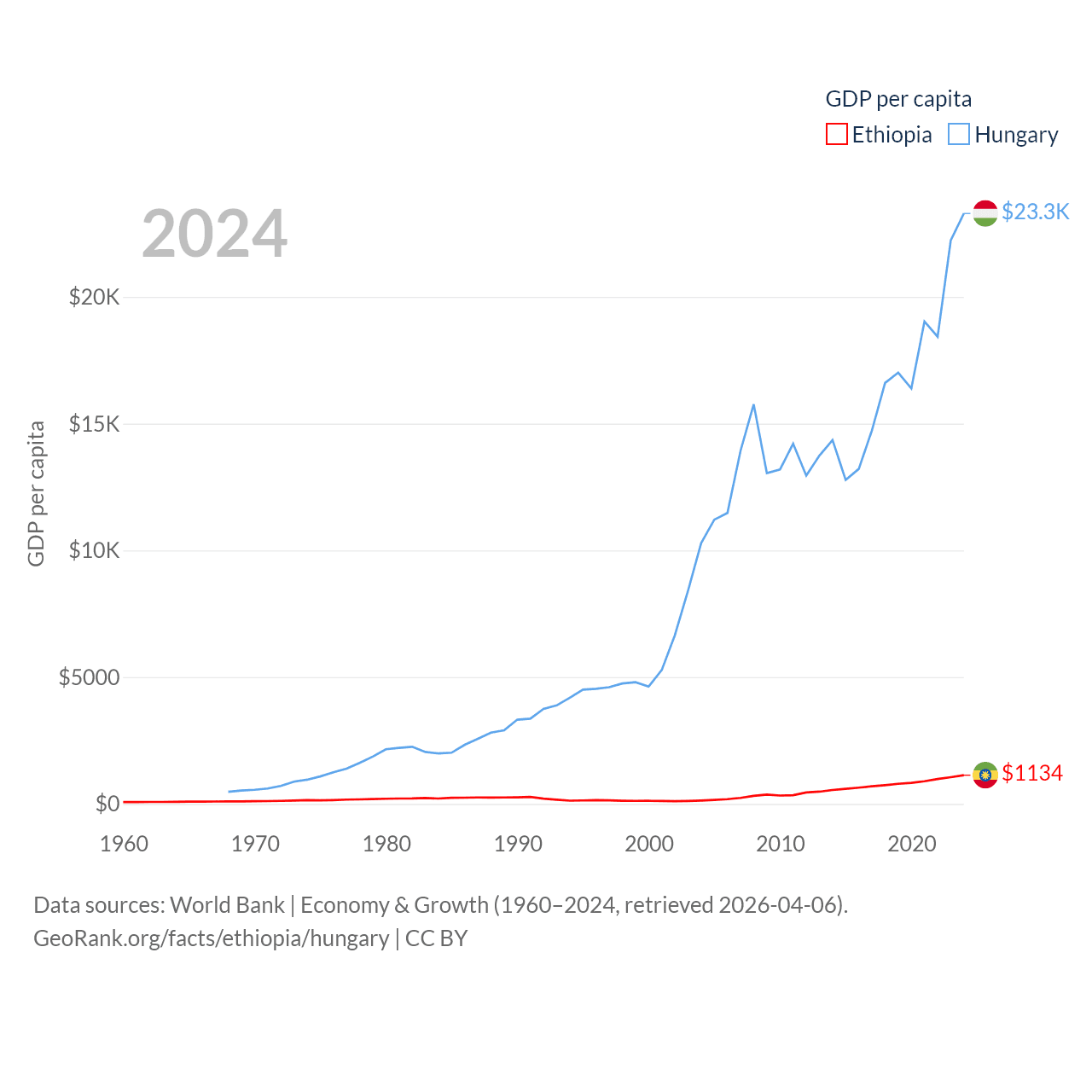 By GDP, Ethiopia ranks 60/197 ($150B) and Hungary ranks 55/197 ($223B). By GDP per capita, Ethiopia ranks 171/197 ($1,134), while Hungary ranks 55/197 ($23,292).