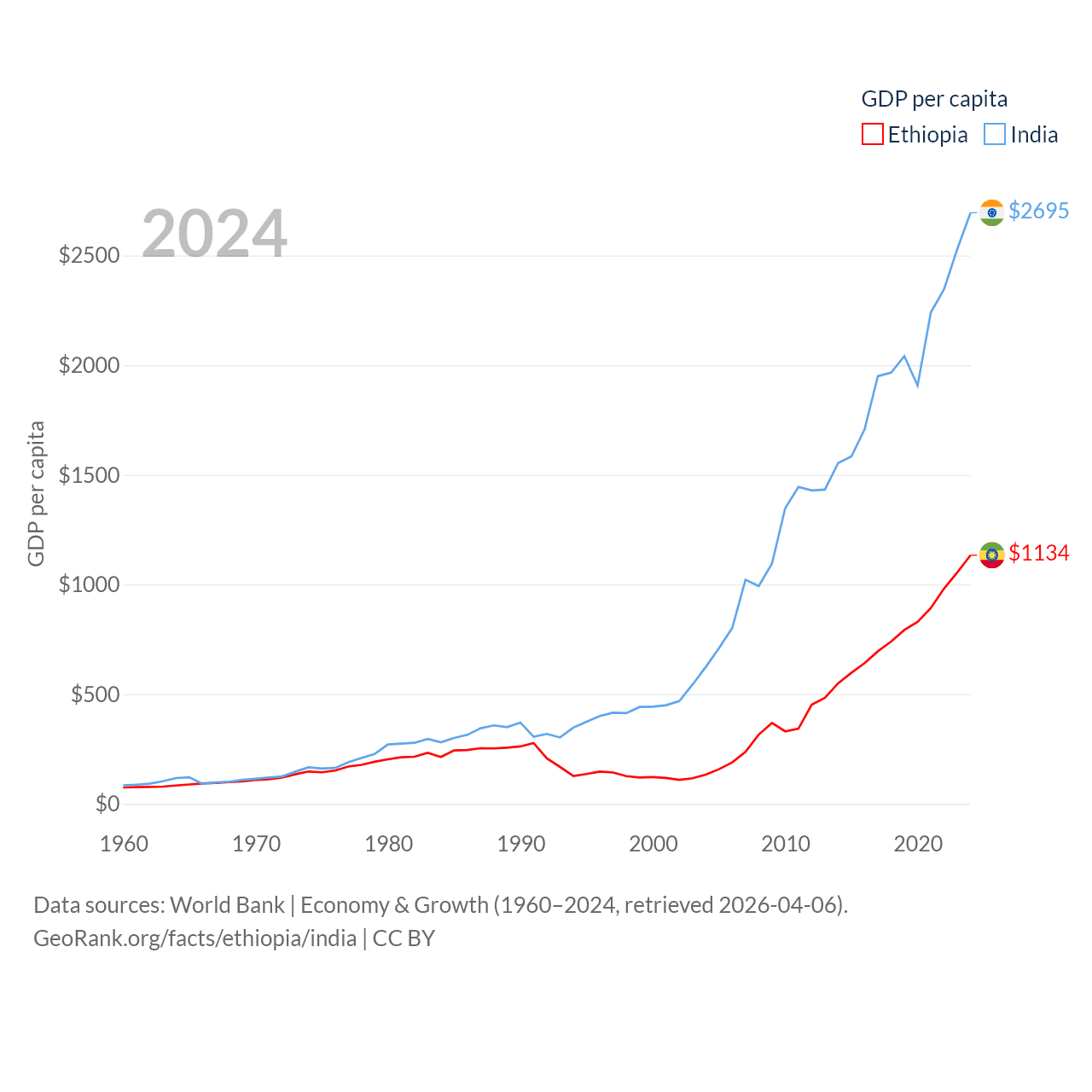 By GDP, Ethiopia ranks 60/197 ($150B) and India ranks 5/197 ($3.91T). By GDP per capita, Ethiopia ranks 171/197 ($1,134), while India ranks 143/197 ($2,695).