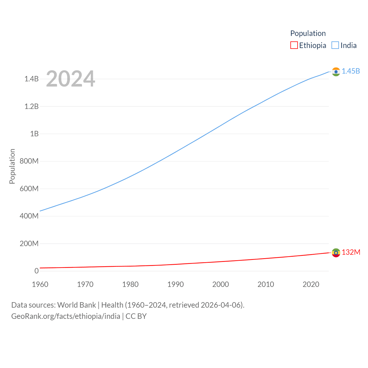 Ethiopia has a population of 132M (ranked 10/197), compared with 1.45B in India (ranked 1/197). Ethiopia's land area is 435,716 sq mi versus 1,147,955 sq mi for India (ranked 25th vs. 7th).