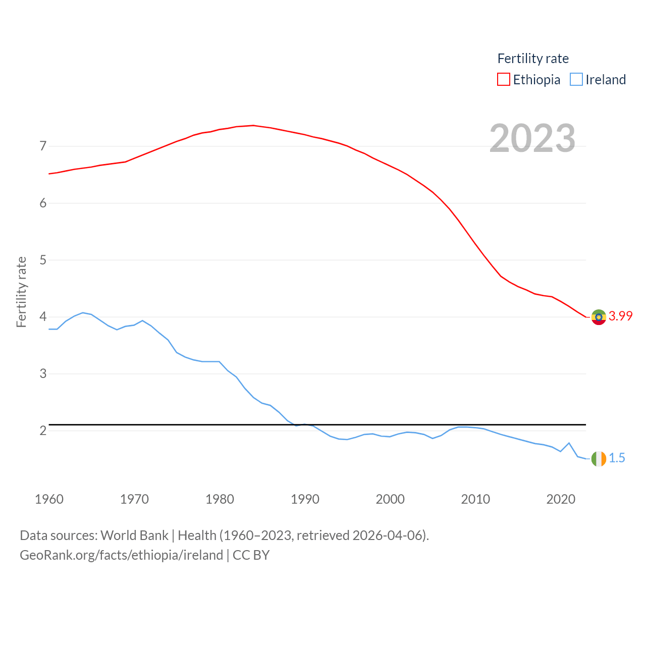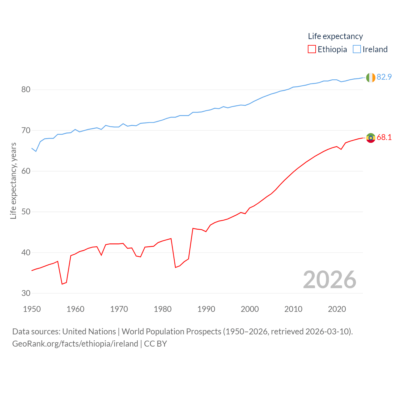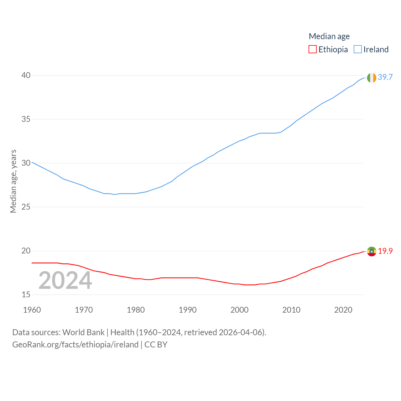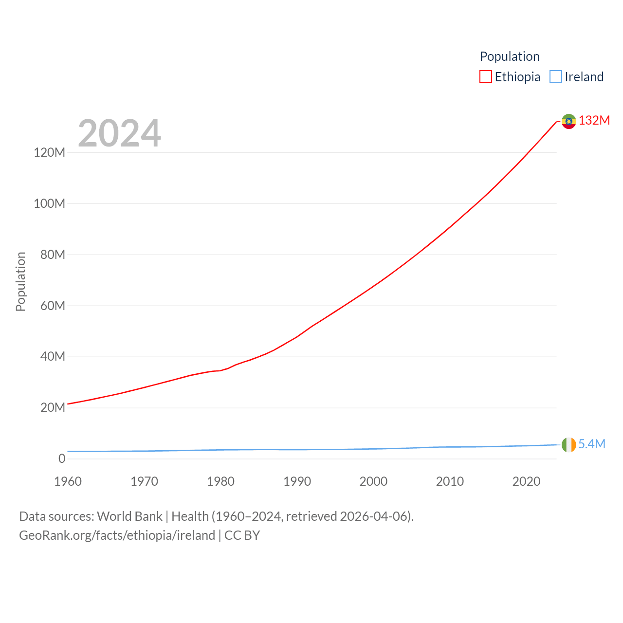 Ethiopia has a population of 132M (ranked 10/197), compared with 5.4M in Ireland (ranked 120/197). Ethiopia's land area is 435,716 sq mi versus 26,599 sq mi for Ireland (ranked 25th vs. 119th).