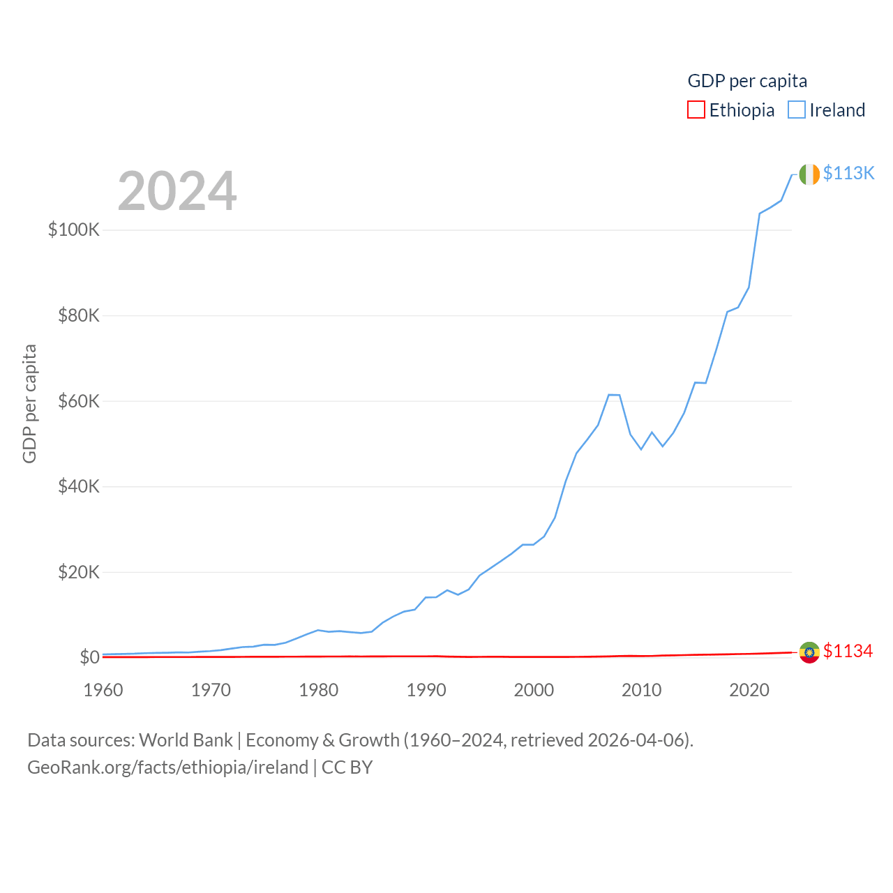 By GDP, Ethiopia ranks 60/197 ($150B) and Ireland ranks 25/197 ($609B). By GDP per capita, Ethiopia ranks 171/197 ($1,134), while Ireland ranks 4/197 ($112,895).