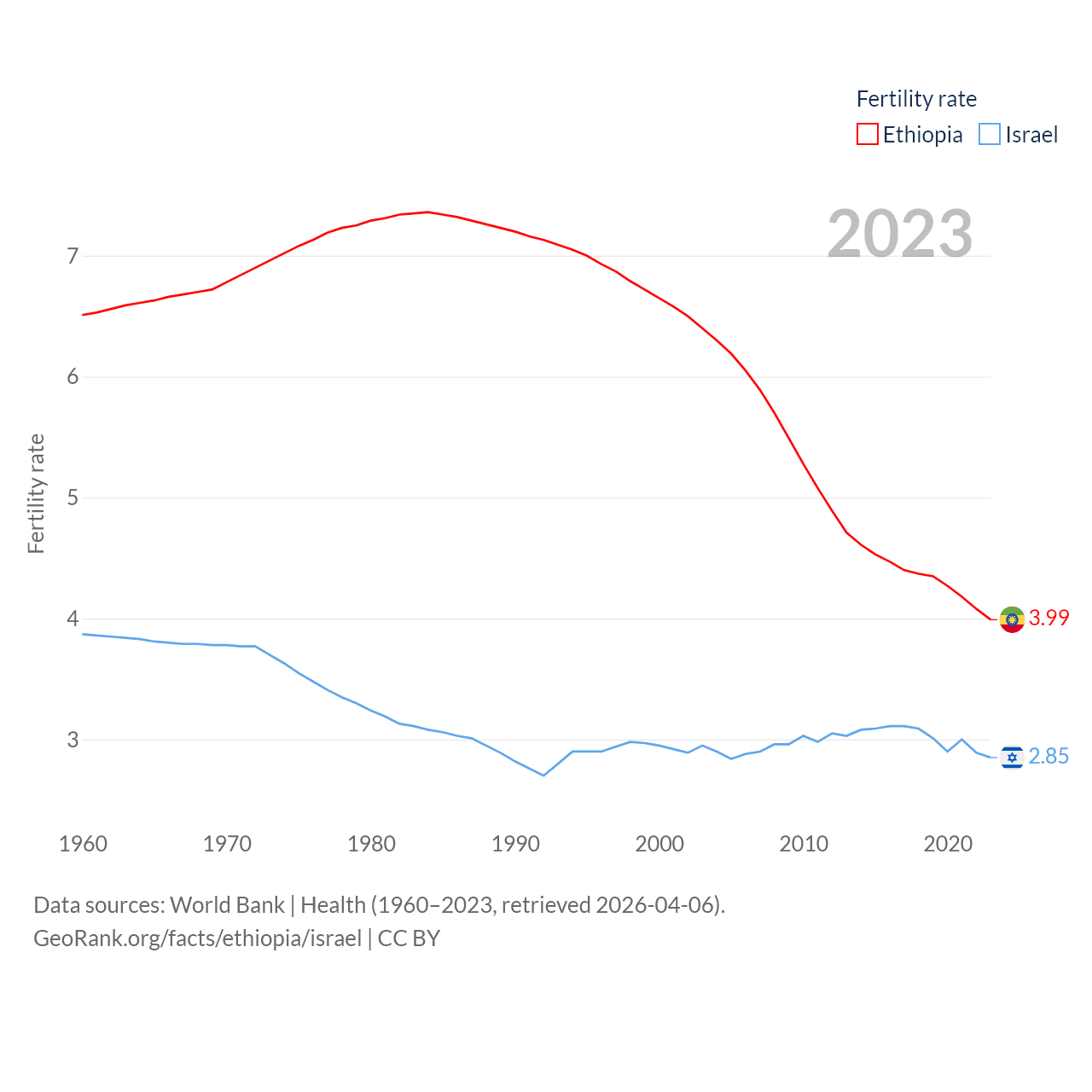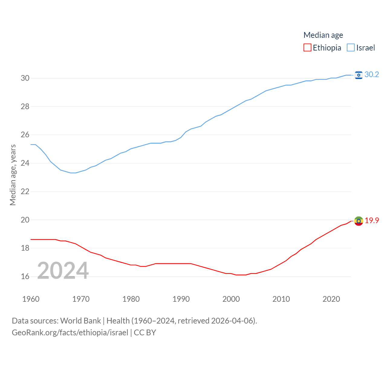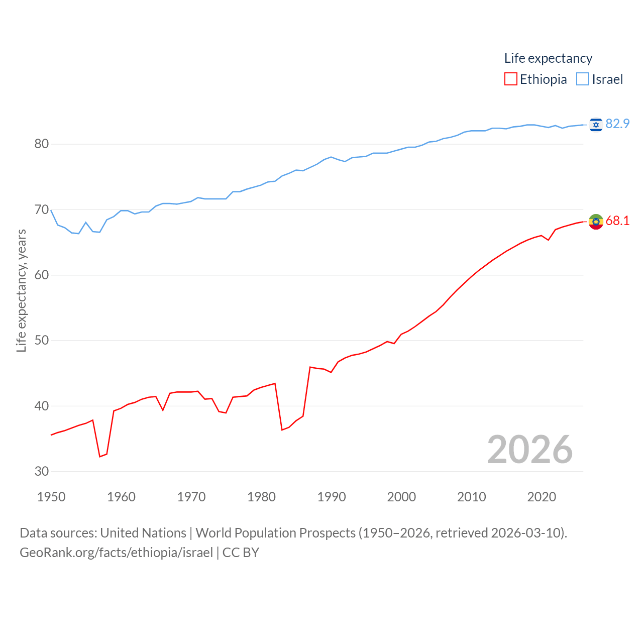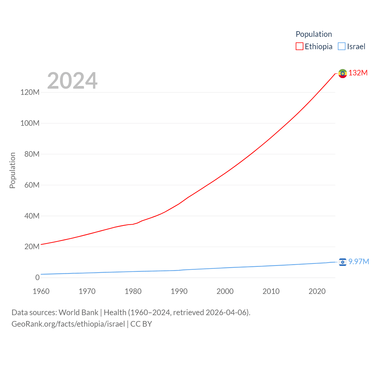 Ethiopia has a population of 132M (ranked 10/197), compared with 9.97M in Israel (ranked 96/197). Ethiopia's land area is 435,716 sq mi versus 8,355 sq mi for Israel (ranked 25th vs. 149th).