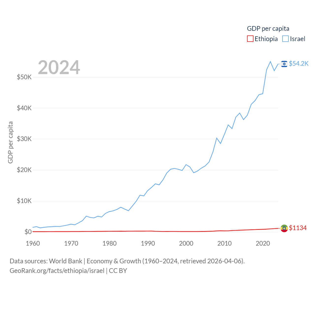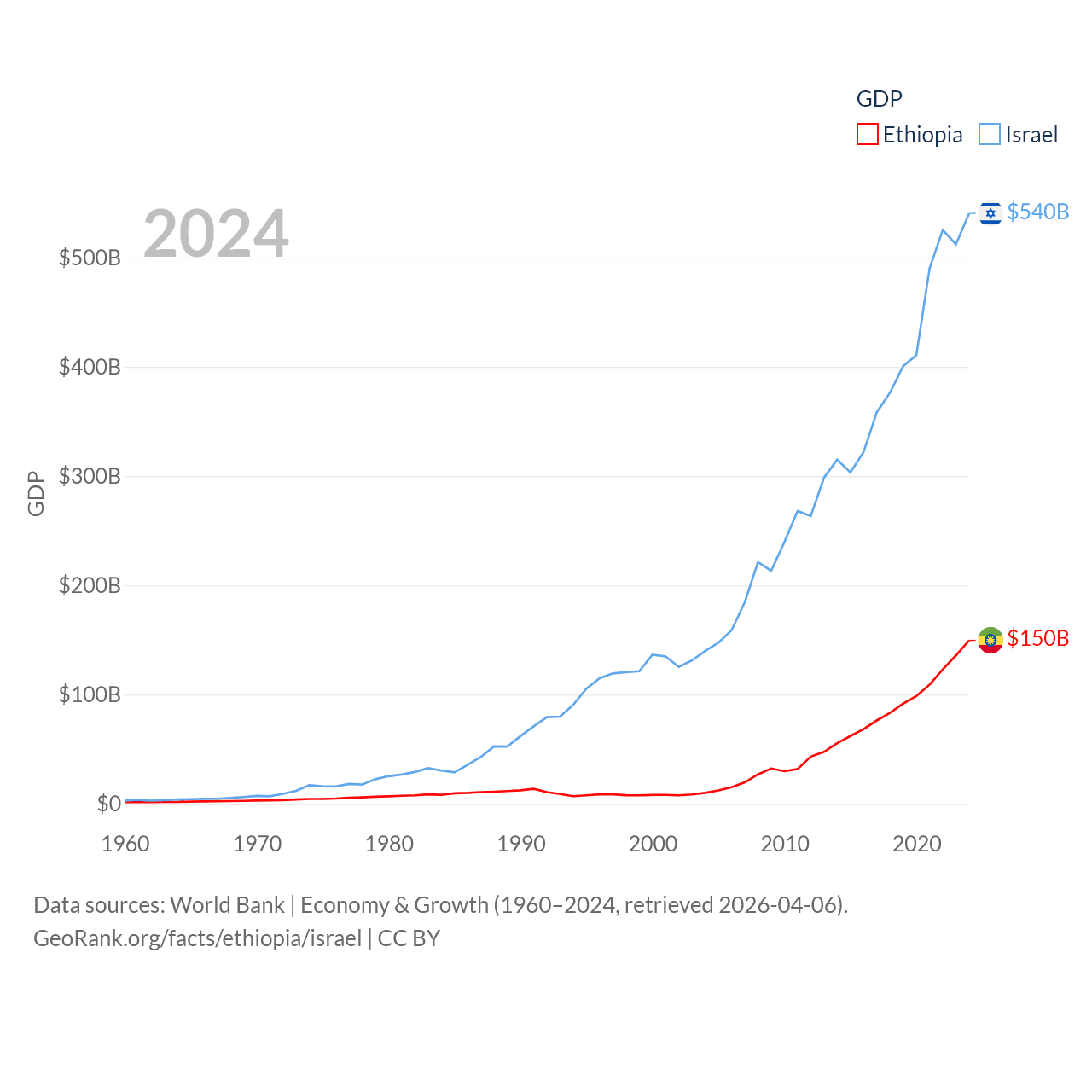 By GDP, Ethiopia ranks 60/197 ($150B) and Israel ranks 29/197 ($540B). By GDP per capita, Ethiopia ranks 171/197 ($1,134), while Israel ranks 21/197 ($54,177).
