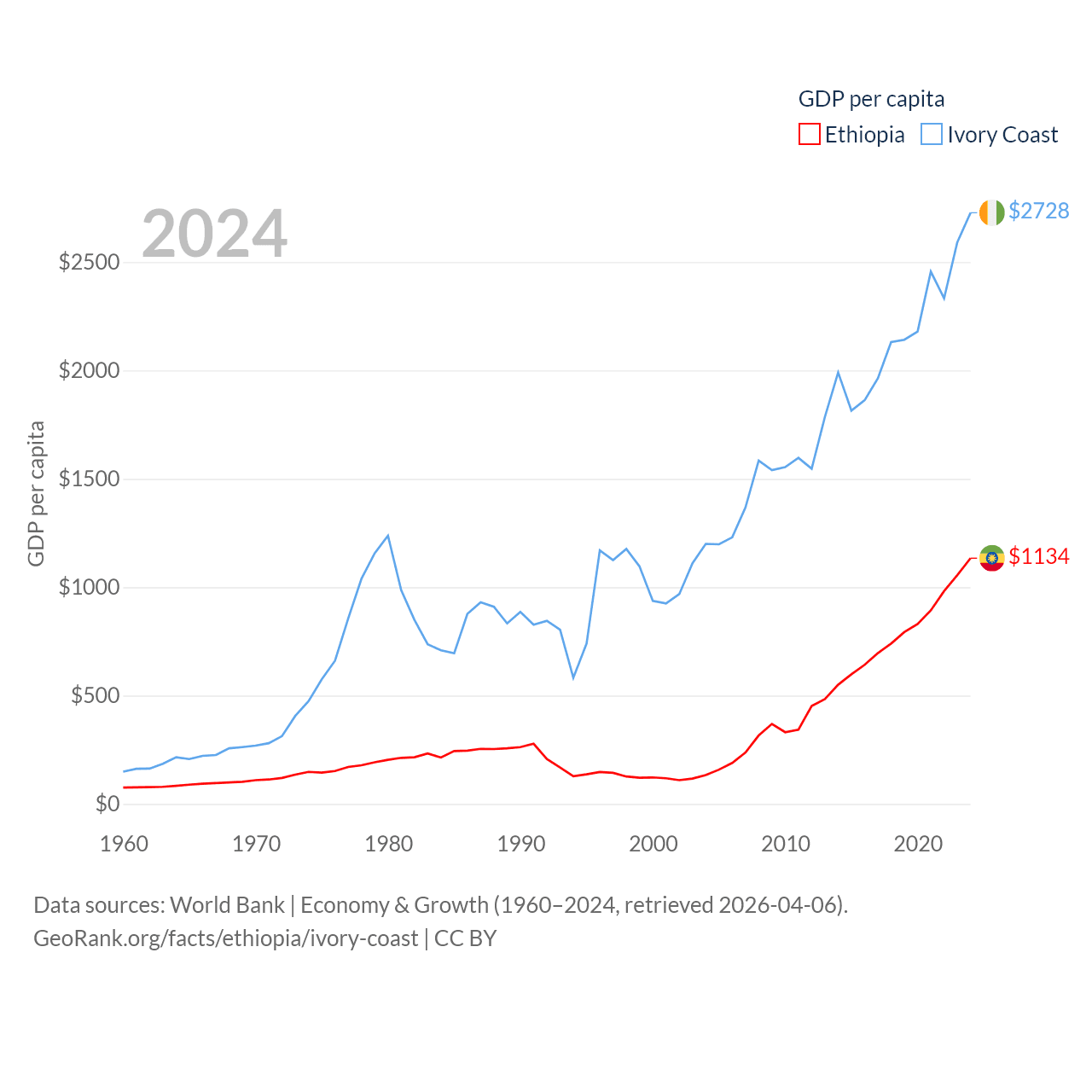 By GDP, Ethiopia ranks 60/197 ($150B) and Ivory Coast ranks 77/197 ($87.1B). By GDP per capita, Ethiopia ranks 171/197 ($1,134), while Ivory Coast ranks 142/197 ($2,728).