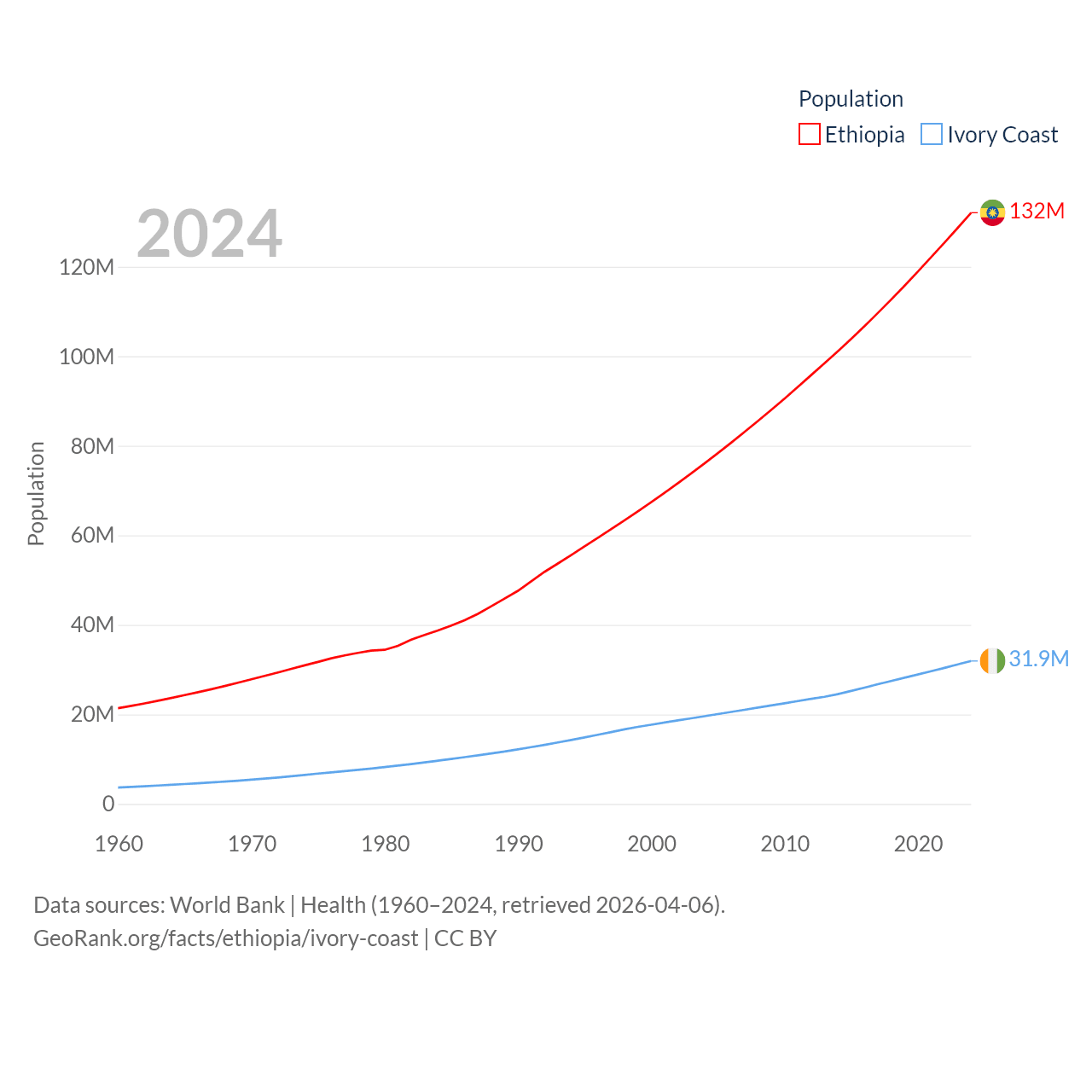 Ethiopia has a population of 132M (ranked 10/197), compared with 31.9M in Ivory Coast (ranked 50/197). Ethiopia's land area is 435,716 sq mi versus 122,780 sq mi for Ivory Coast (ranked 25th vs. 66th).