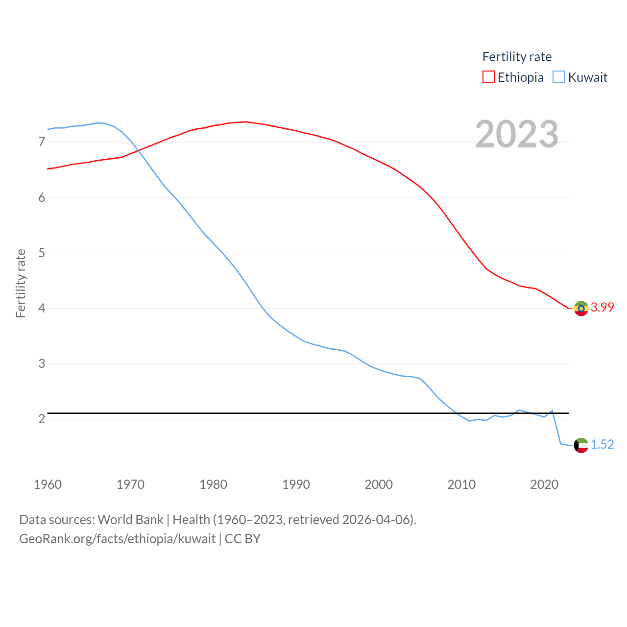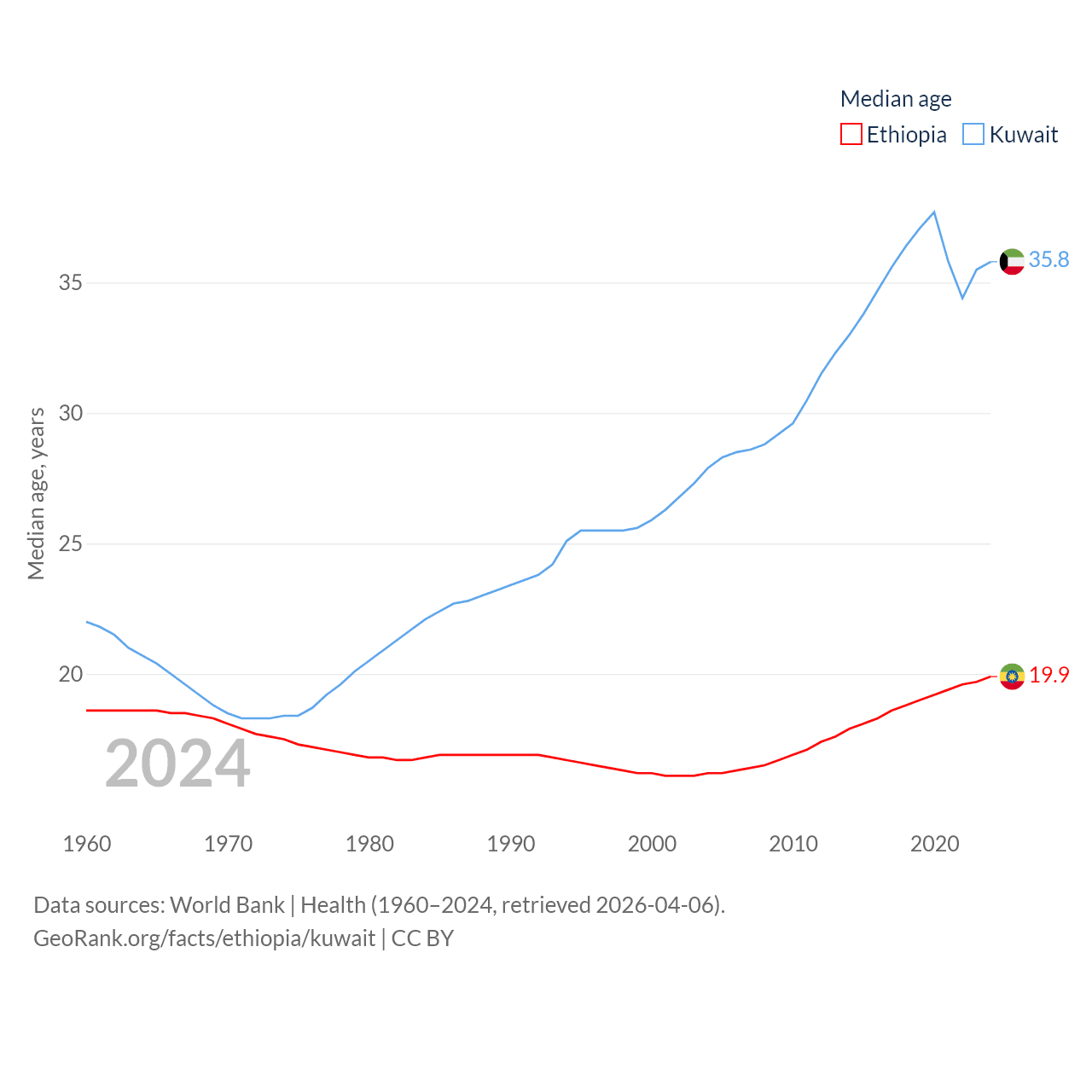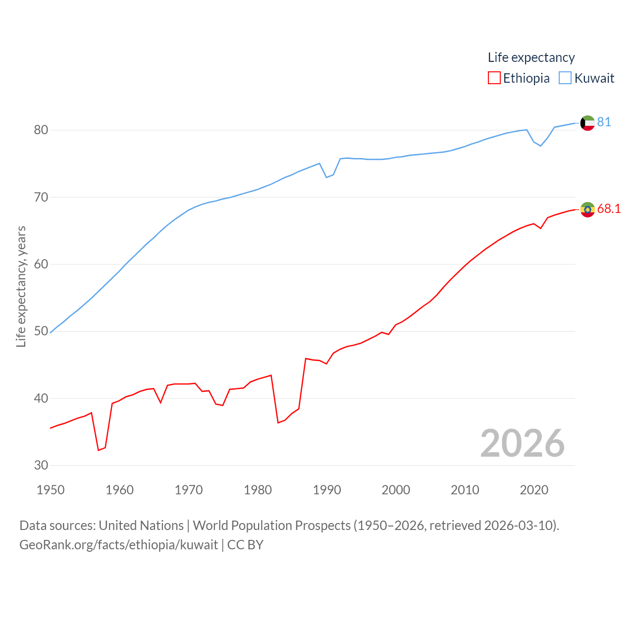 Ethiopia has a population of 132M (ranked 10/197), compared with 4.9M in Kuwait (ranked 127/197). Ethiopia's land area is 435,716 sq mi versus 6,880 sq mi for Kuwait (ranked 25th vs. 153rd).