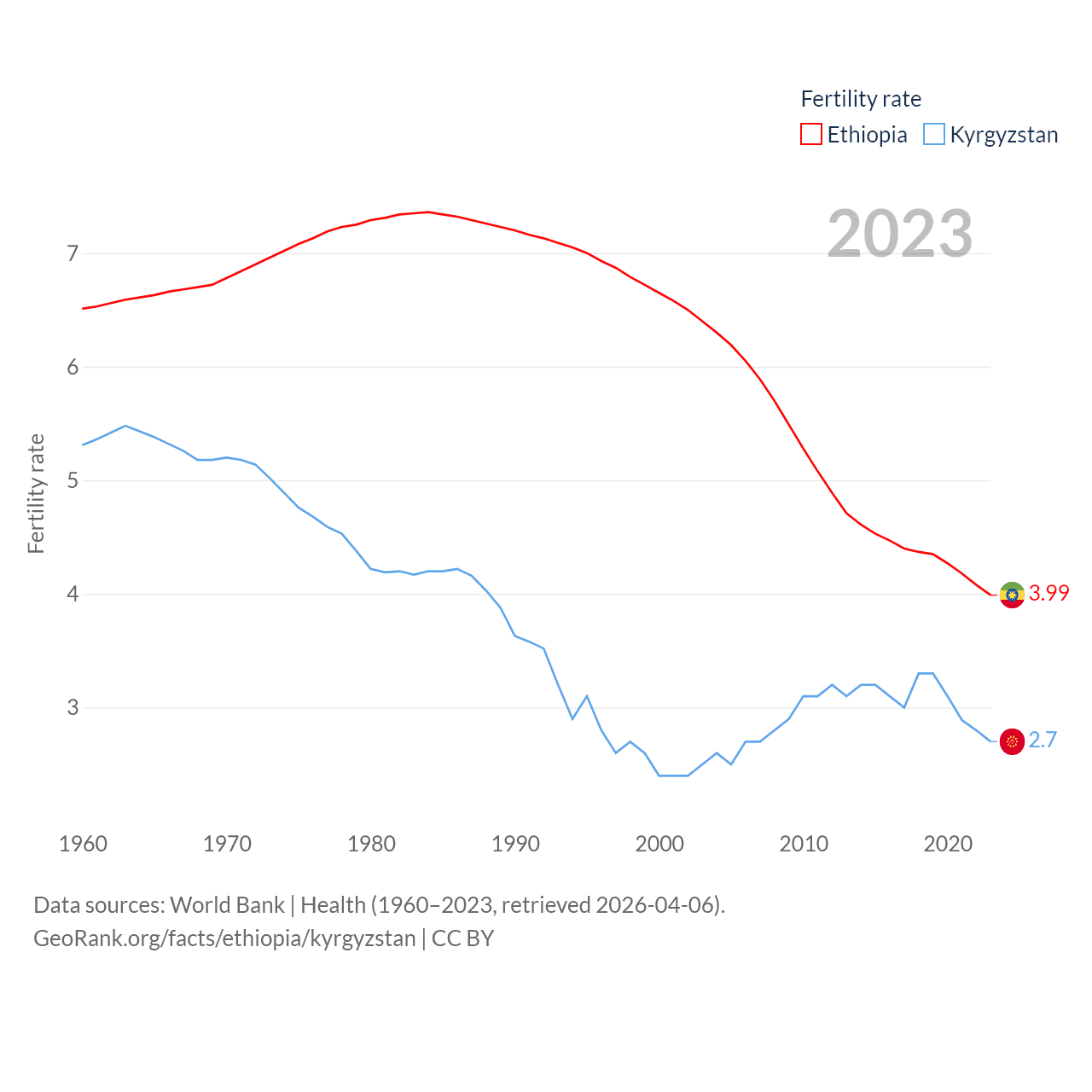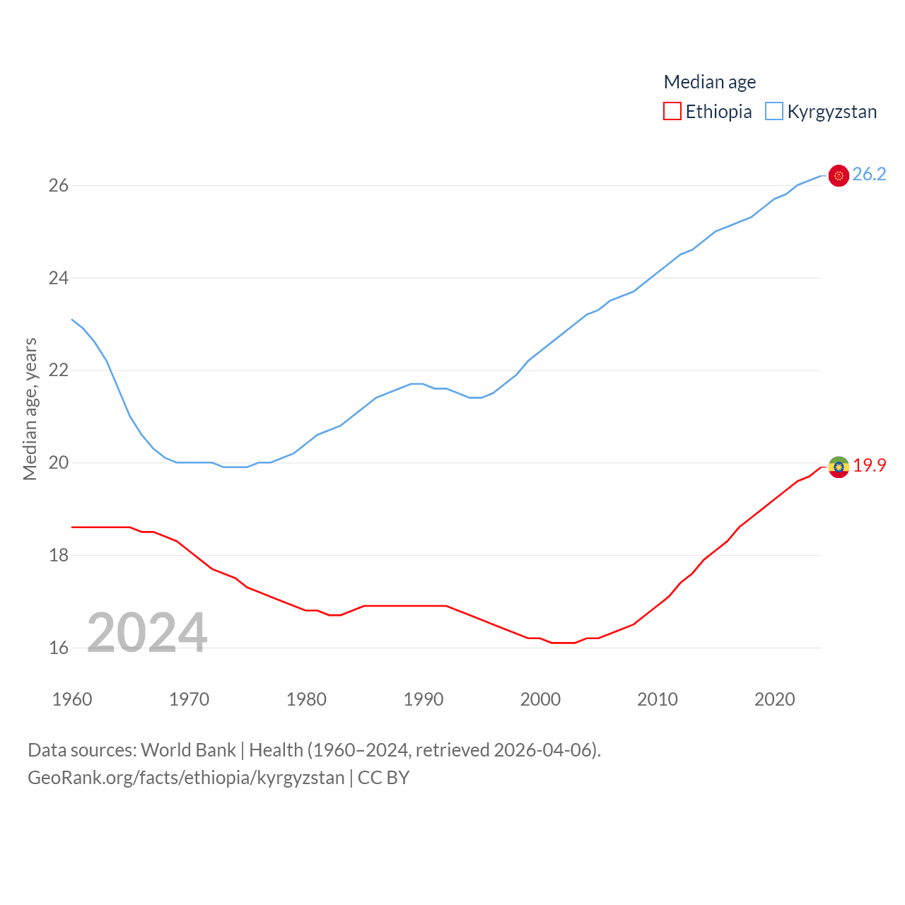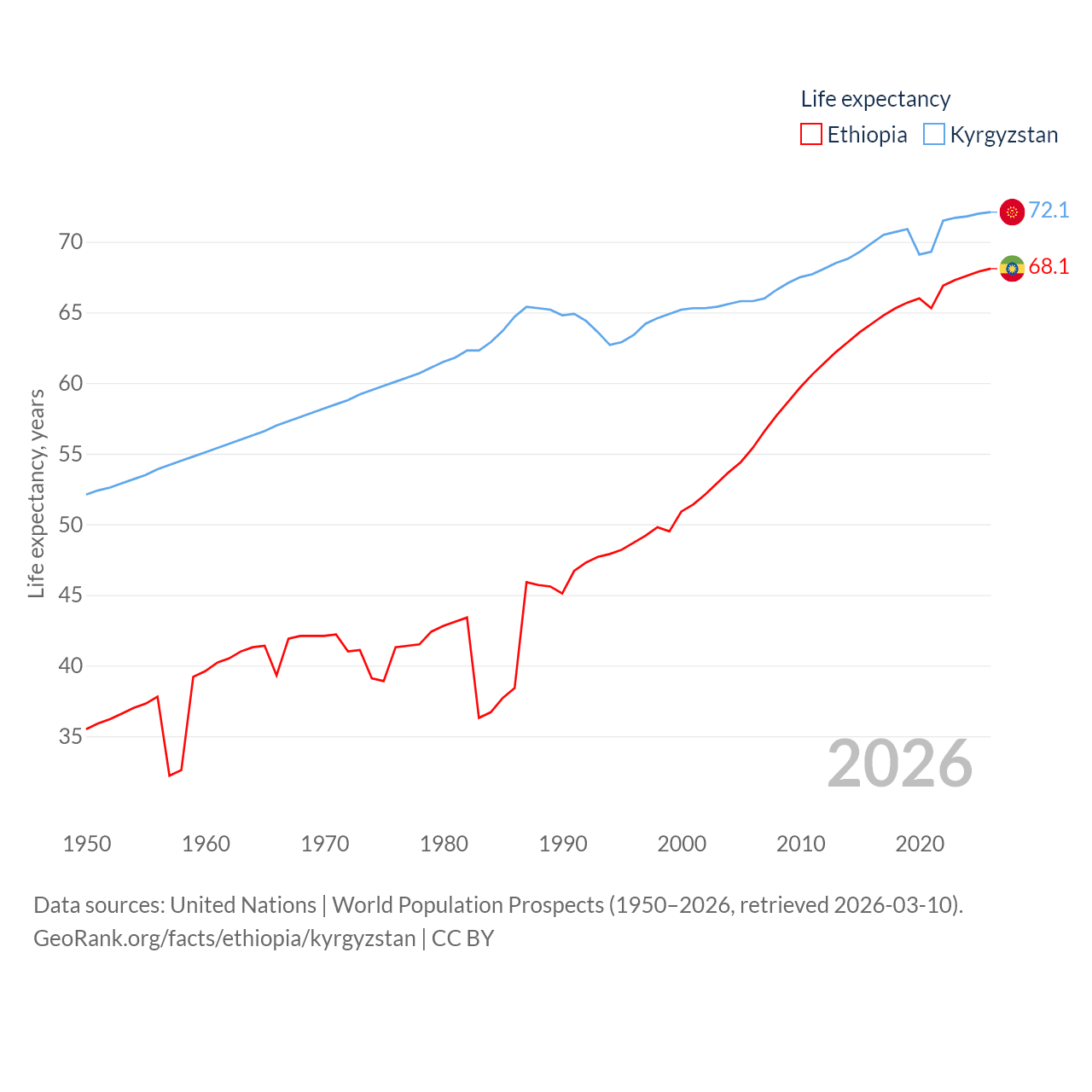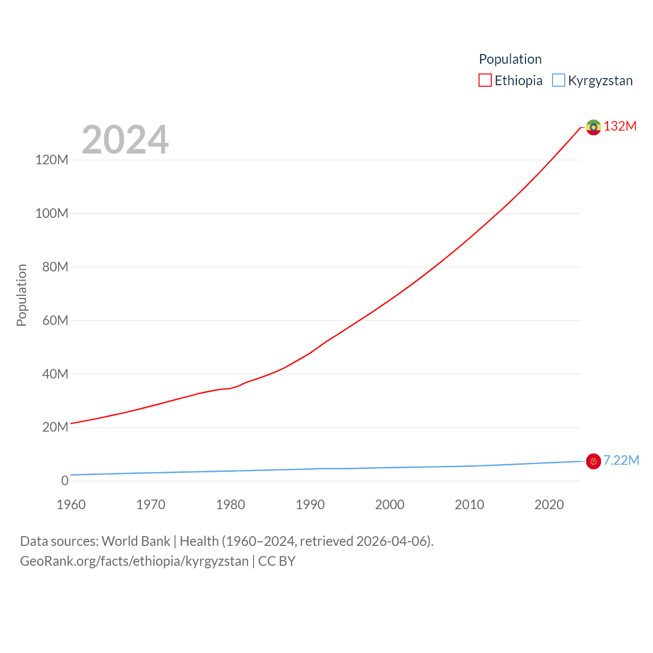 Ethiopia has a population of 132M (ranked 10/197), compared with 7.22M in Kyrgyzstan (ranked 106/197). Ethiopia's land area is 435,716 sq mi versus 74,054 sq mi for Kyrgyzstan (ranked 25th vs. 86th).