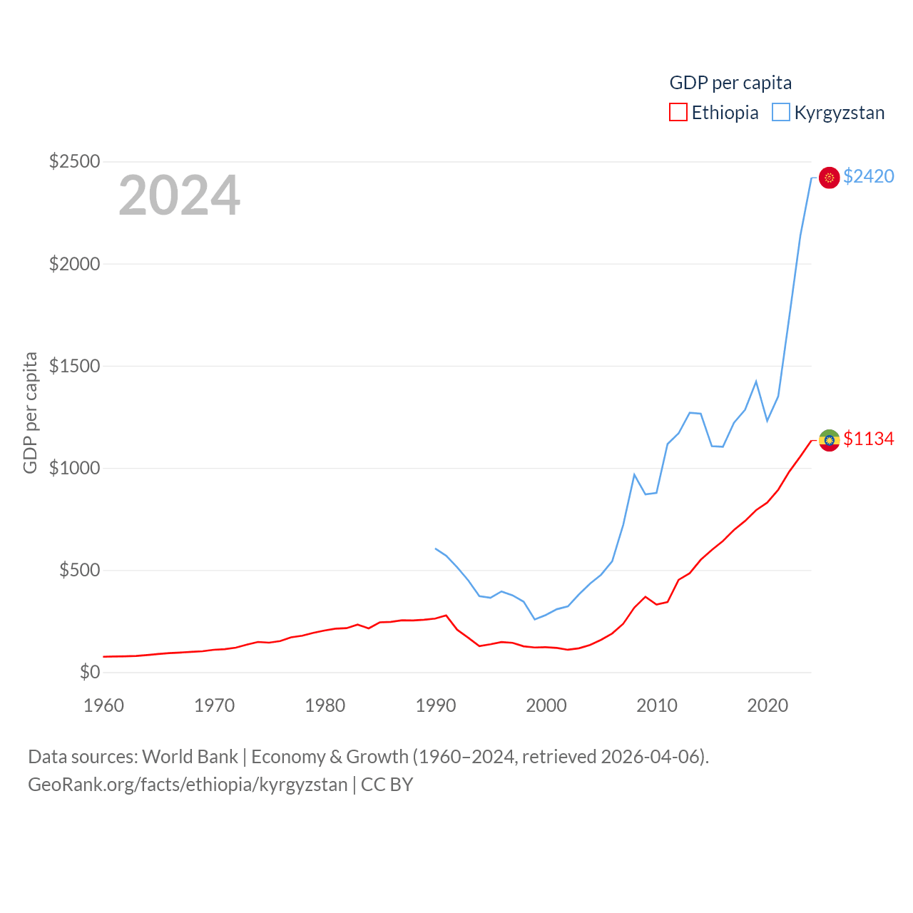 By GDP, Ethiopia ranks 60/197 ($150B) and Kyrgyzstan ranks 135/197 ($17.5B). By GDP per capita, Ethiopia ranks 171/197 ($1,134), while Kyrgyzstan ranks 150/197 ($2,420).