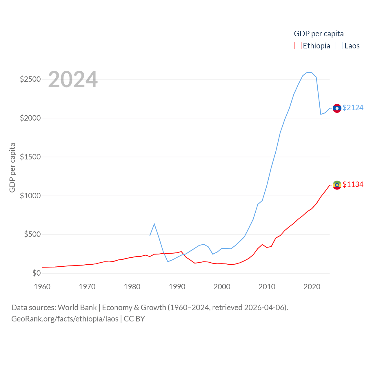By GDP, Ethiopia ranks 60/197 ($150B) and Laos ranks 139/197 ($16.5B). By GDP per capita, Ethiopia ranks 171/197 ($1,134), while Laos ranks 155/197 ($2,124).