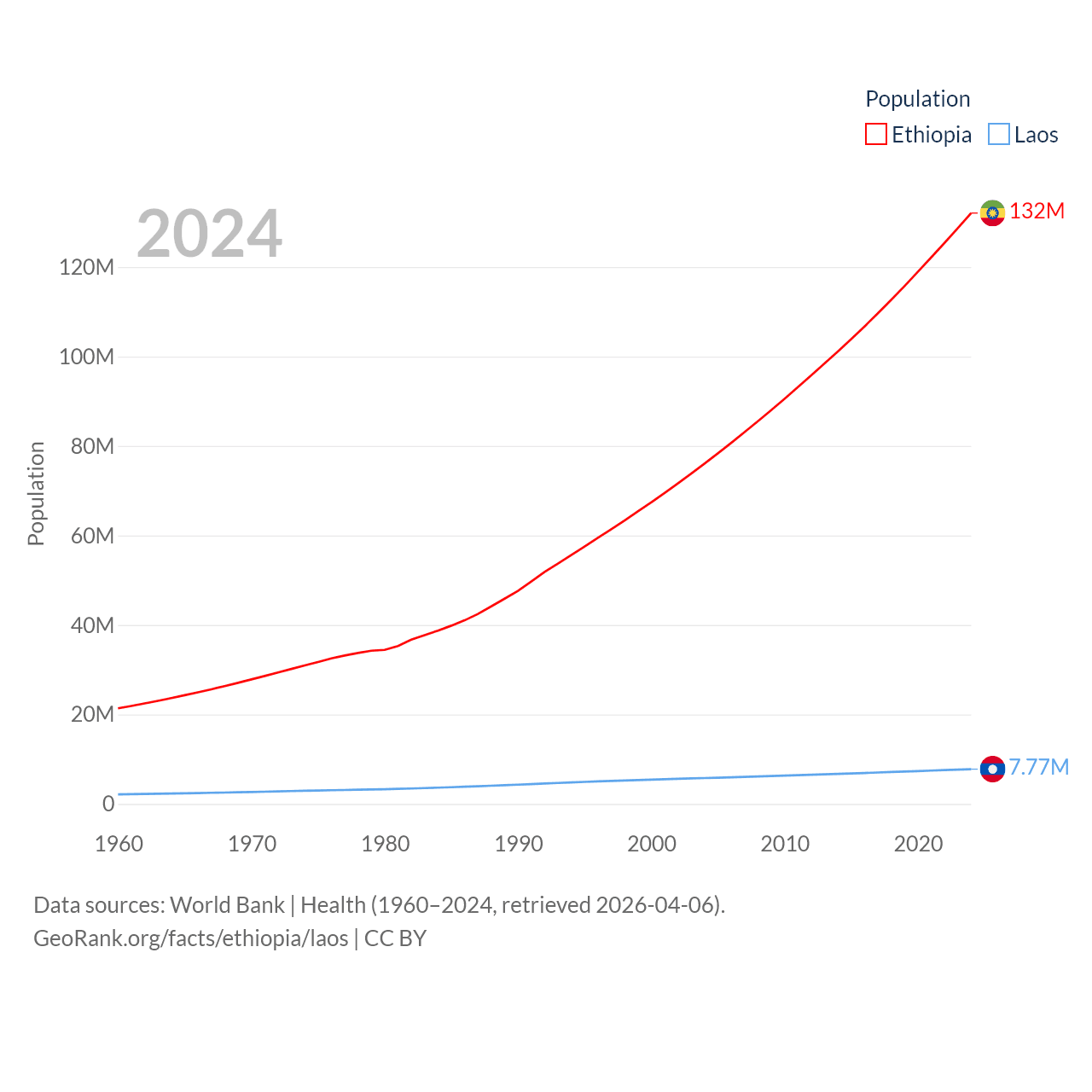 Ethiopia has a population of 132M (ranked 10/197), compared with 7.77M in Laos (ranked 103/197). Ethiopia's land area is 435,716 sq mi versus 89,112 sq mi for Laos (ranked 25th vs. 79th).