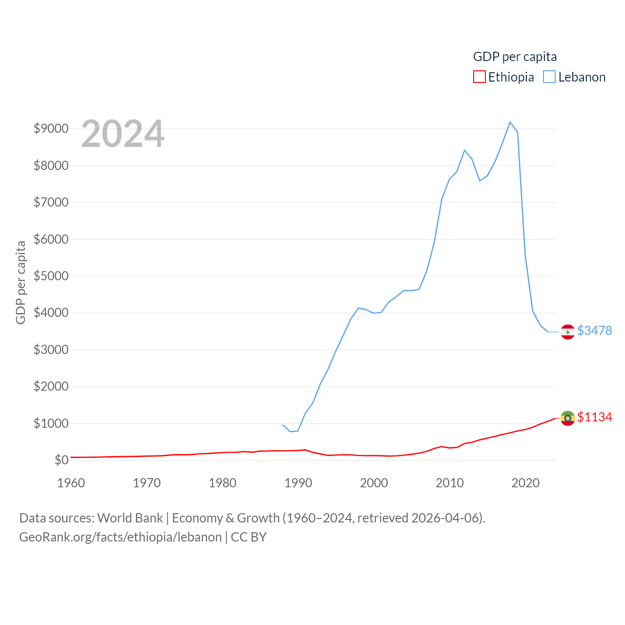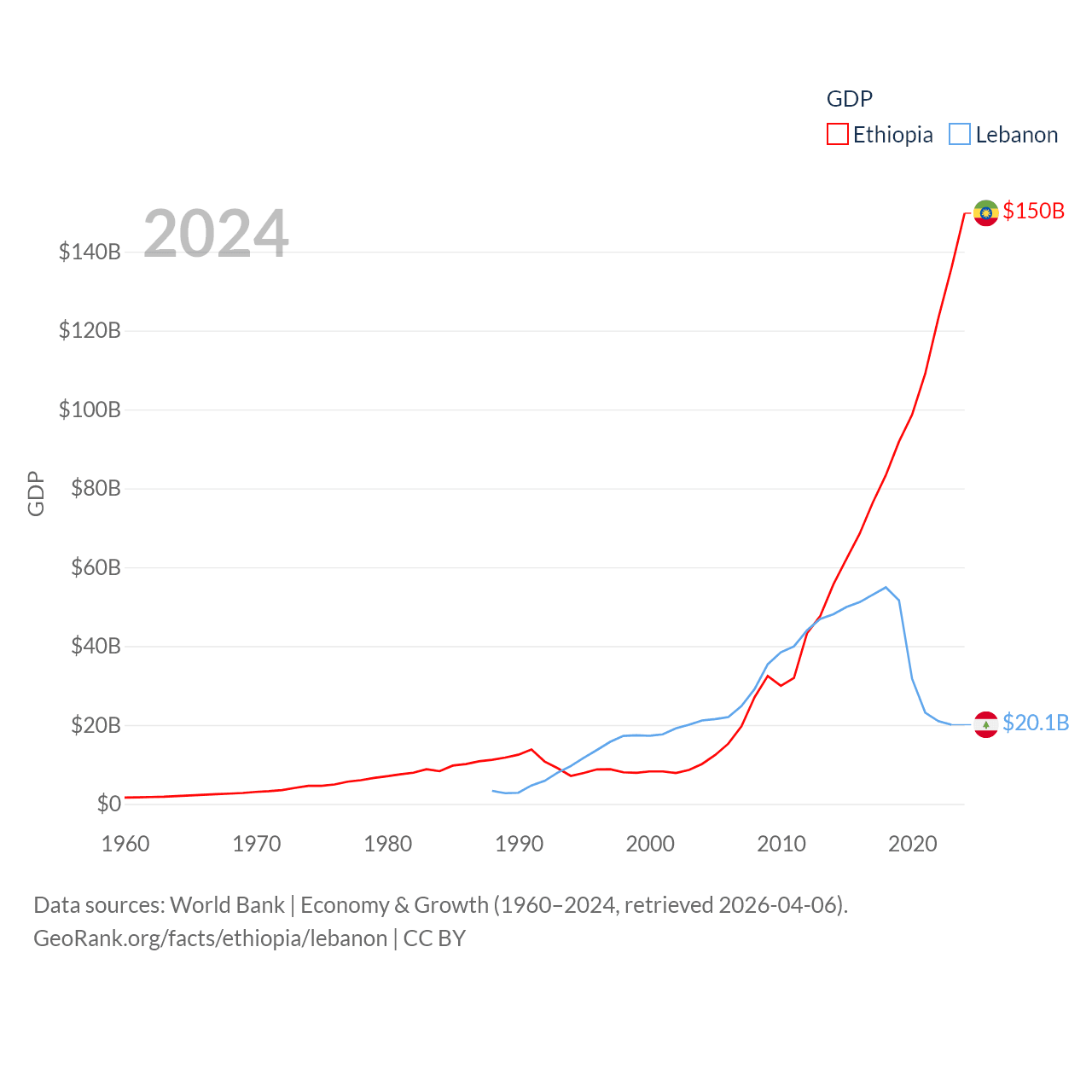 By GDP, Ethiopia ranks 60/197 ($150B) and Lebanon ranks 128/197 ($20.1B). By GDP per capita, Ethiopia ranks 171/197 ($1,134), while Lebanon ranks 135/197 ($3,478).