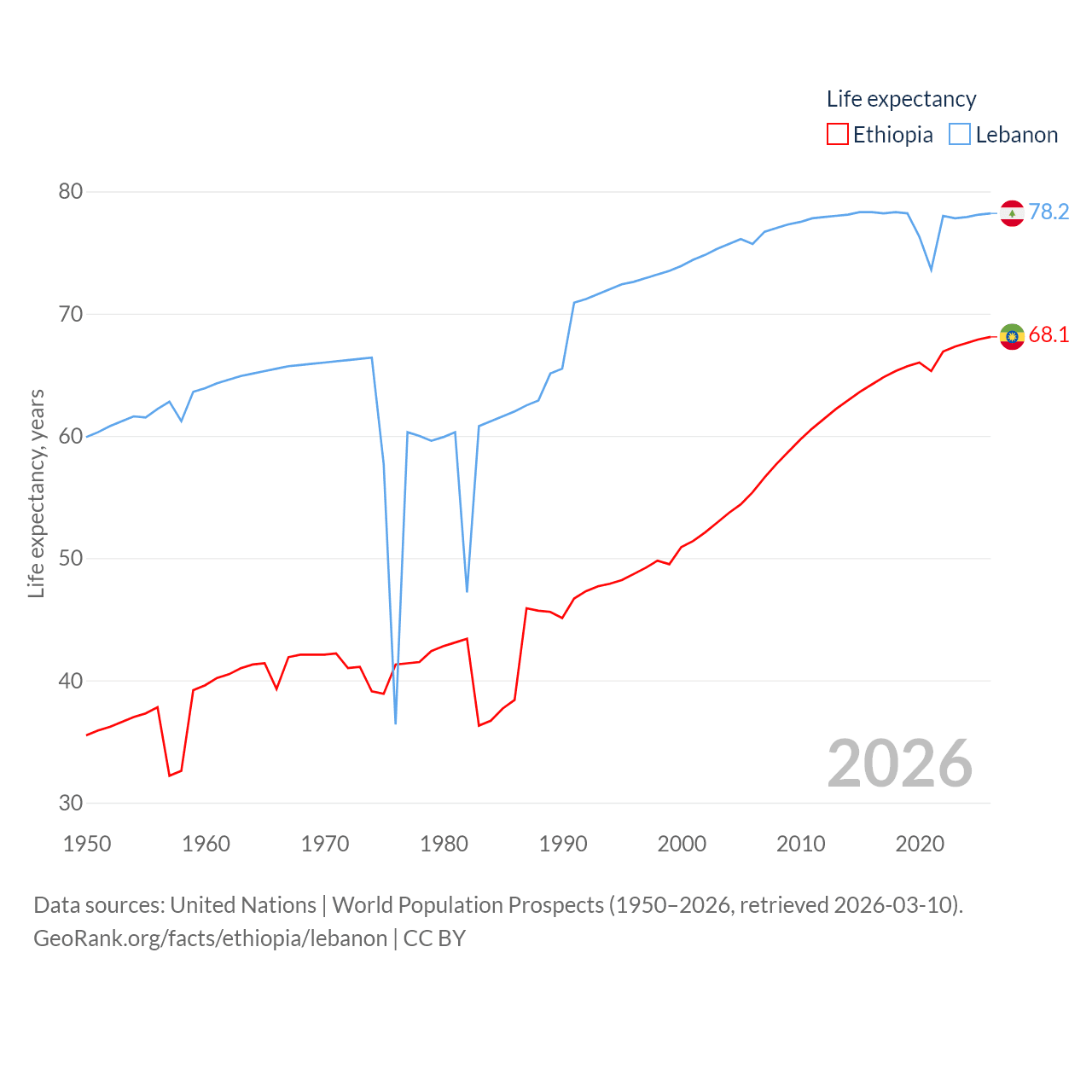 Ethiopia has a population of 132M (ranked 10/197), compared with 5.81M in Lebanon (ranked 115/197). Ethiopia's land area is 435,716 sq mi versus 3,950 sq mi for Lebanon (ranked 25th vs. 160th).