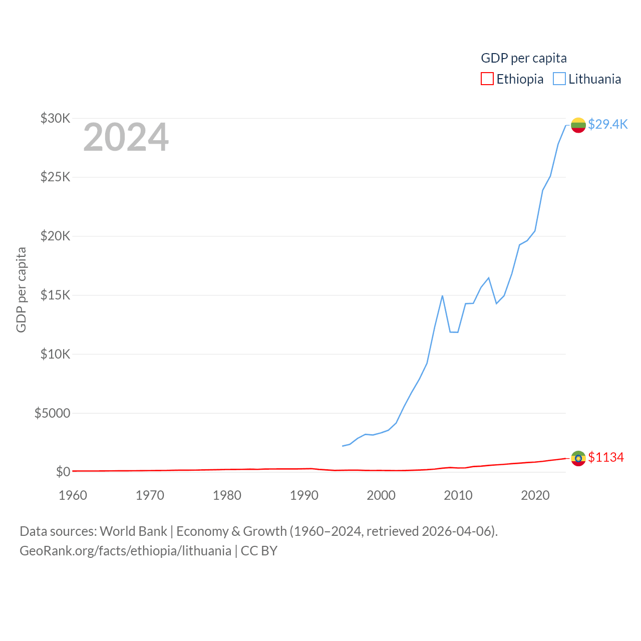 By GDP, Ethiopia ranks 60/197 ($150B) and Lithuania ranks 79/197 ($84.9B). By GDP per capita, Ethiopia ranks 171/197 ($1,134), while Lithuania ranks 43/197 ($29,384).