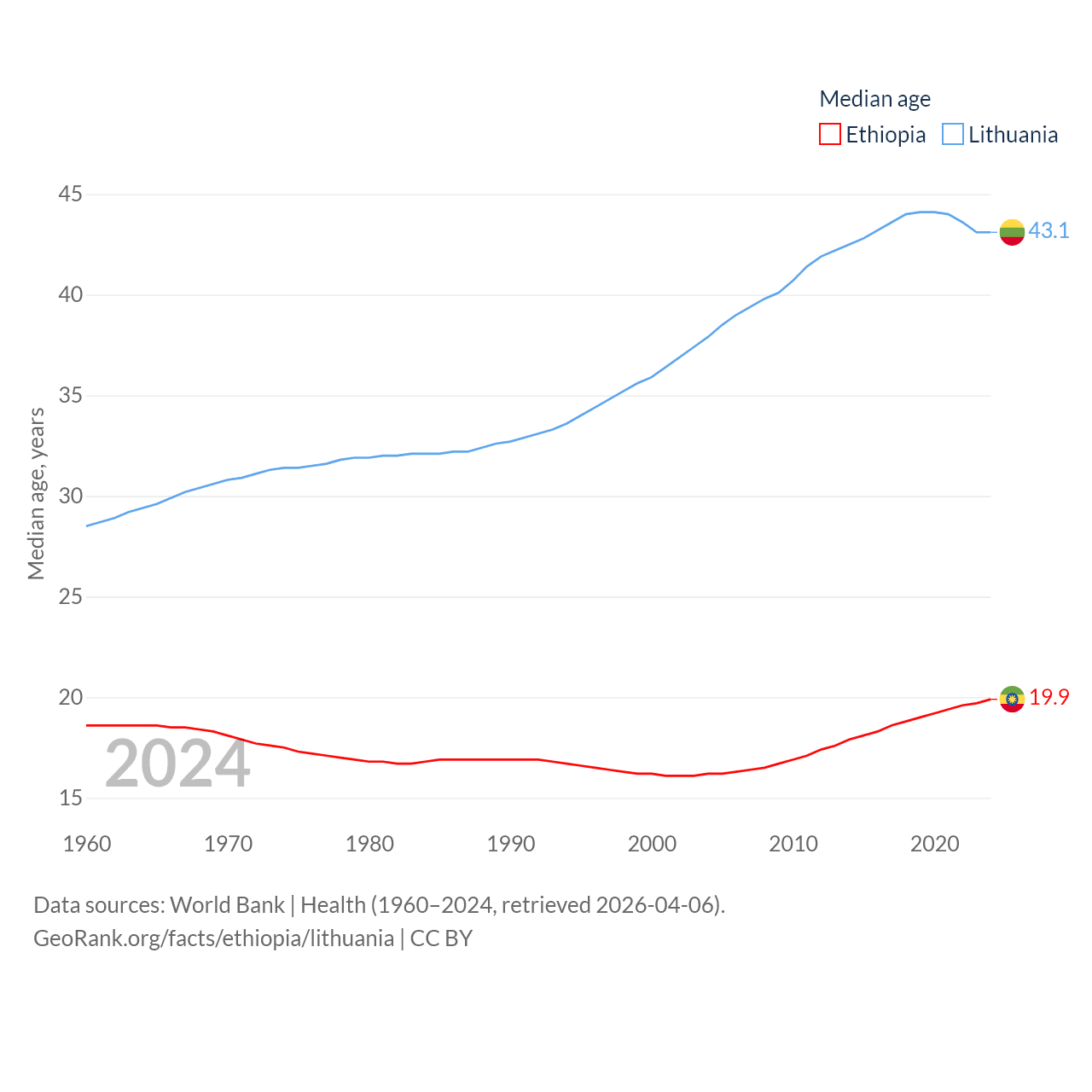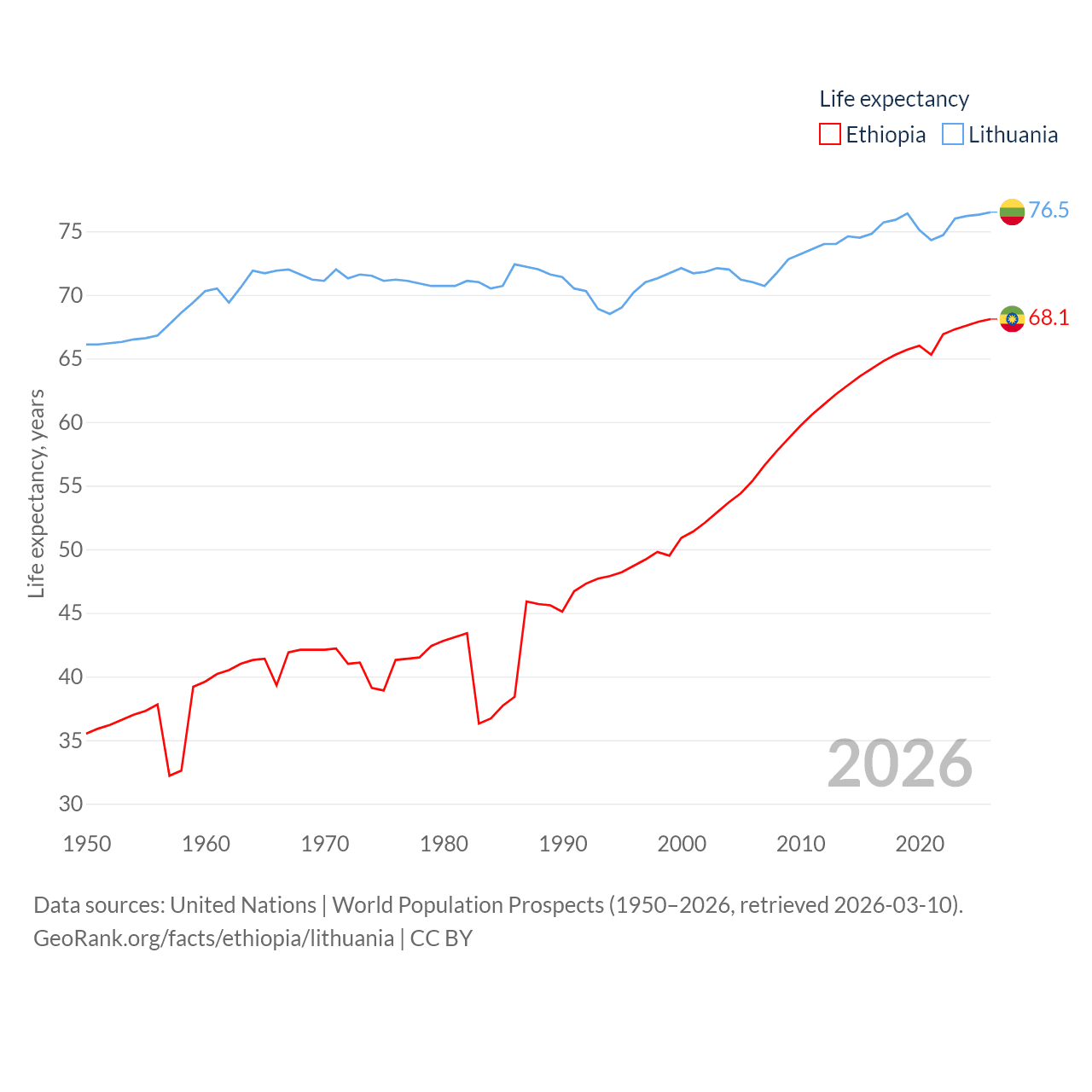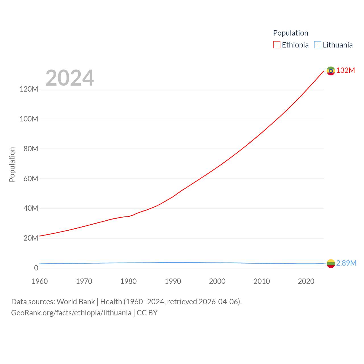 Ethiopia has a population of 132M (ranked 10/197), compared with 2.89M in Lithuania (ranked 137/197). Ethiopia's land area is 435,716 sq mi versus 24,170 sq mi for Lithuania (ranked 25th vs. 120th).