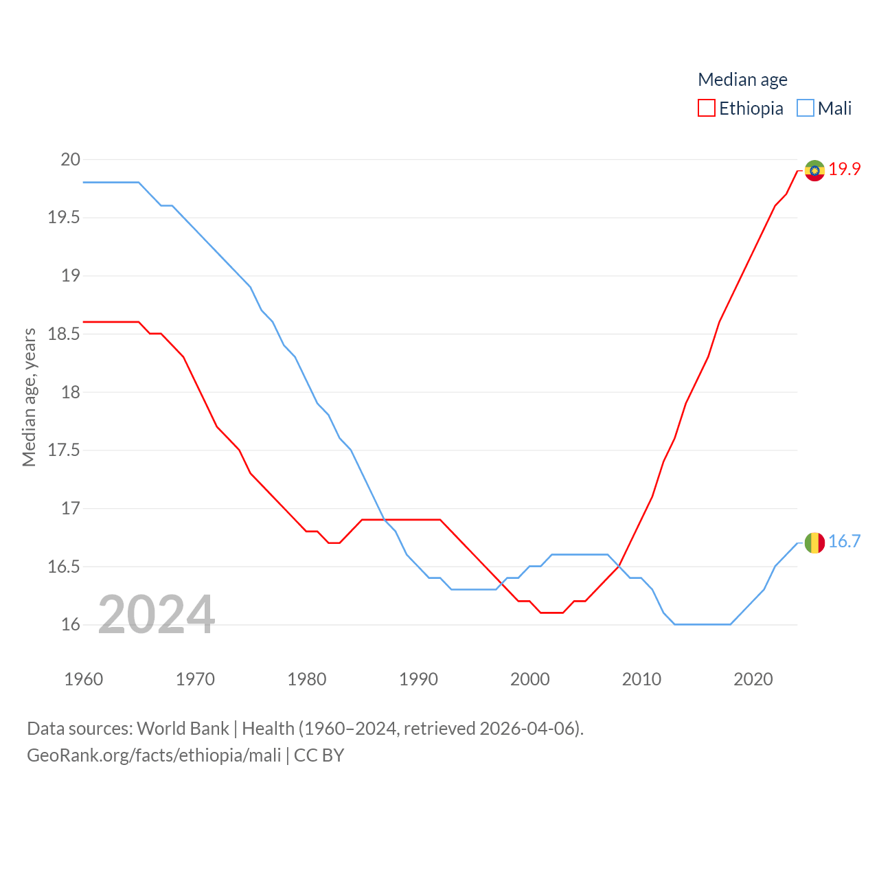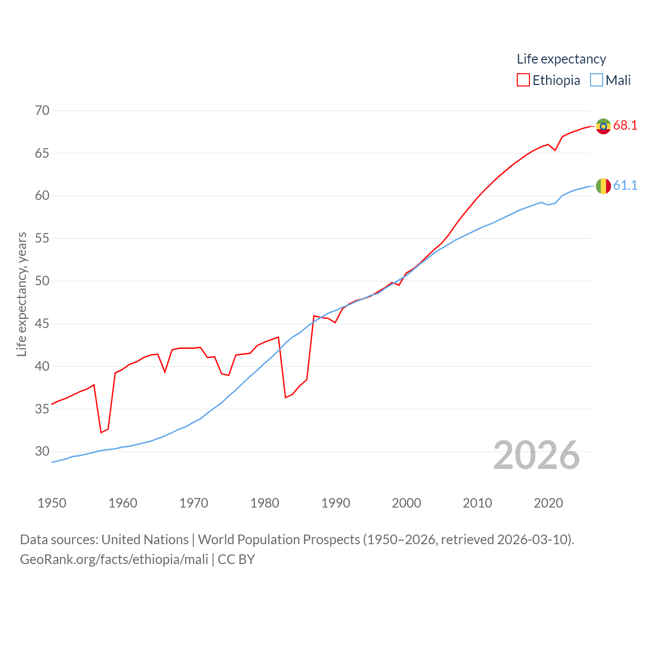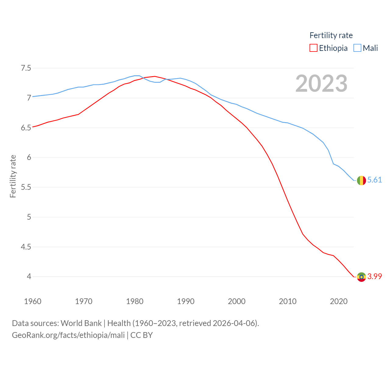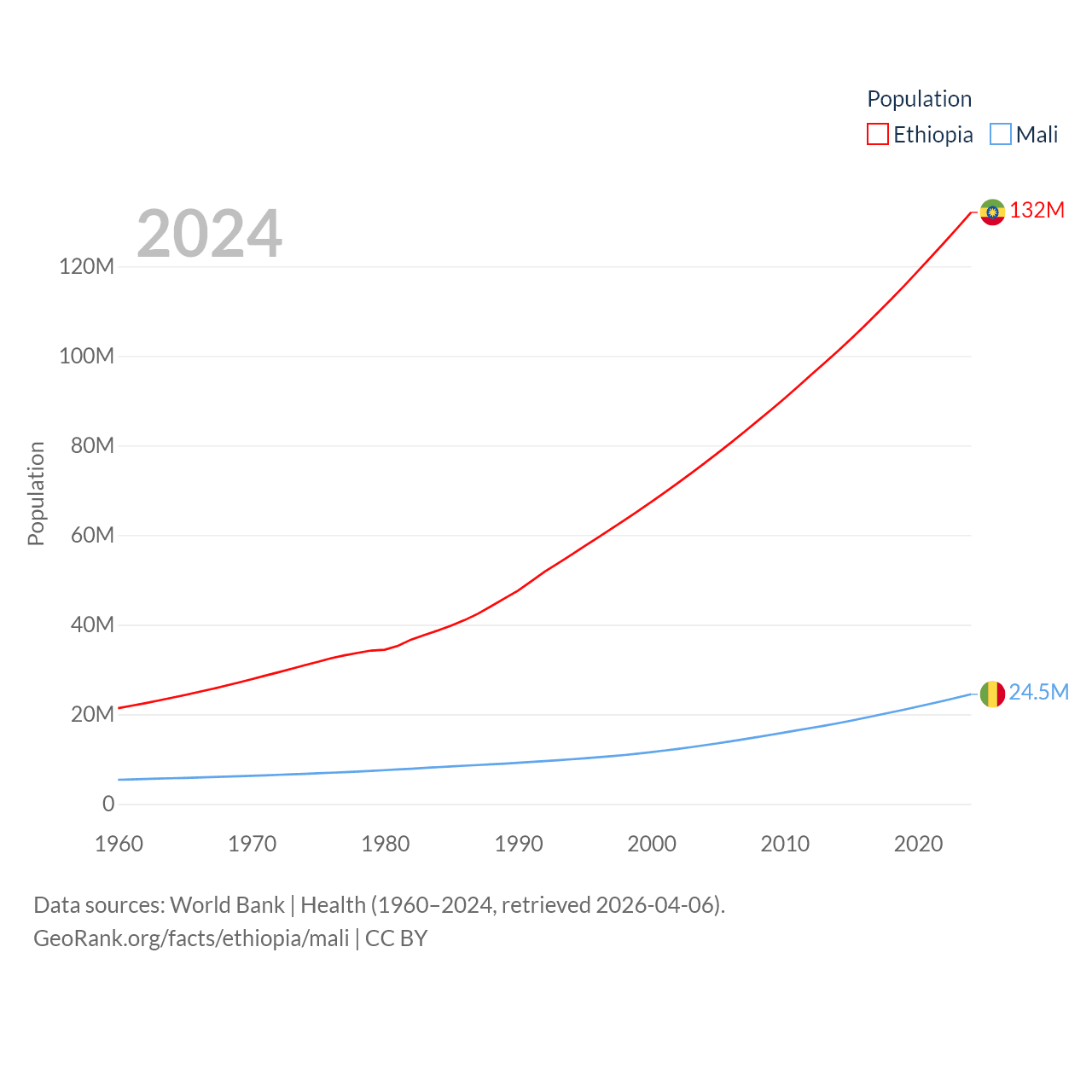 Ethiopia has a population of 132M (ranked 10/197), compared with 24.5M in Mali (ranked 58/197). Ethiopia's land area is 435,716 sq mi versus 471,118 sq mi for Mali (ranked 25th vs. 23rd).