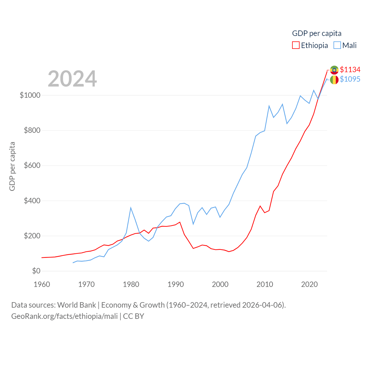 By GDP, Ethiopia ranks 60/197 ($150B) and Mali ranks 113/197 ($26.8B). By GDP per capita, Ethiopia ranks 171/197 ($1,134), while Mali ranks 173/197 ($1,095).