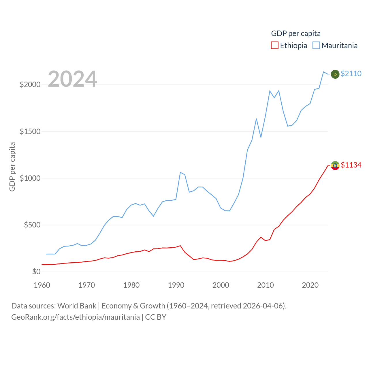 By GDP, Ethiopia ranks 60/197 ($150B) and Mauritania ranks 153/197 ($10.9B). By GDP per capita, Ethiopia ranks 171/197 ($1,134), while Mauritania ranks 156/197 ($2,110).