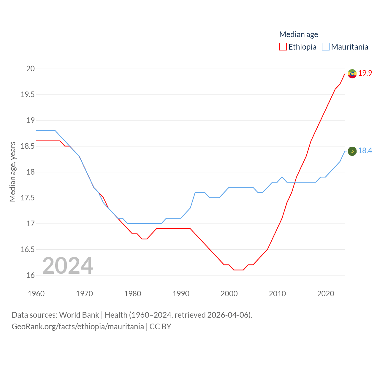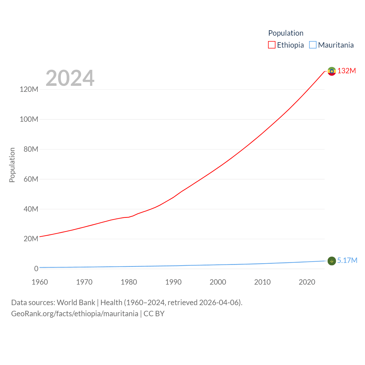 Ethiopia has a population of 132M (ranked 10/197), compared with 5.17M in Mauritania (ranked 125/197). Ethiopia's land area is 435,716 sq mi versus 397,955 sq mi for Mauritania (ranked 25th vs. 28th).