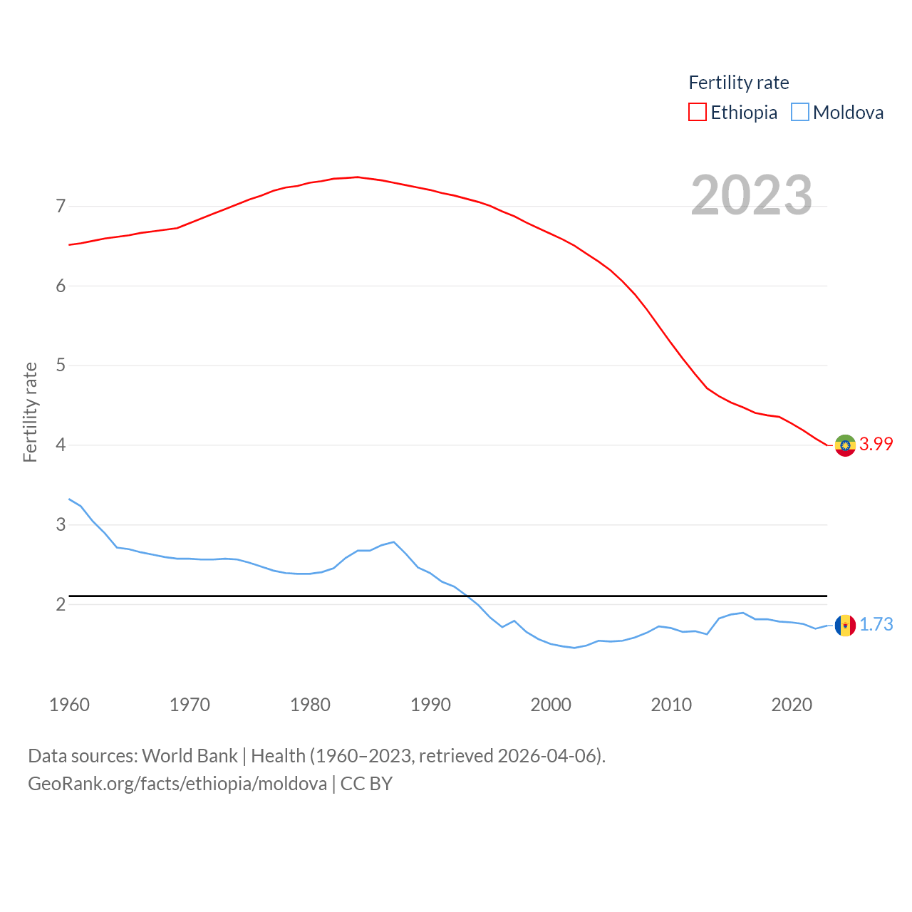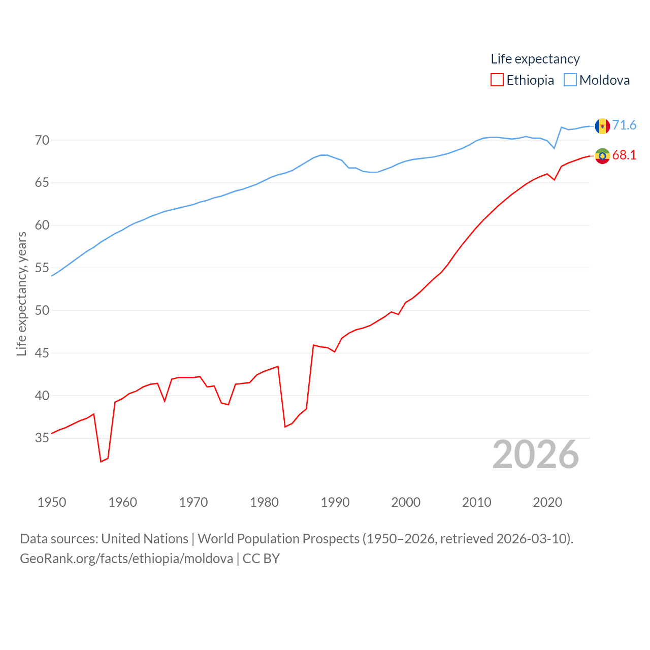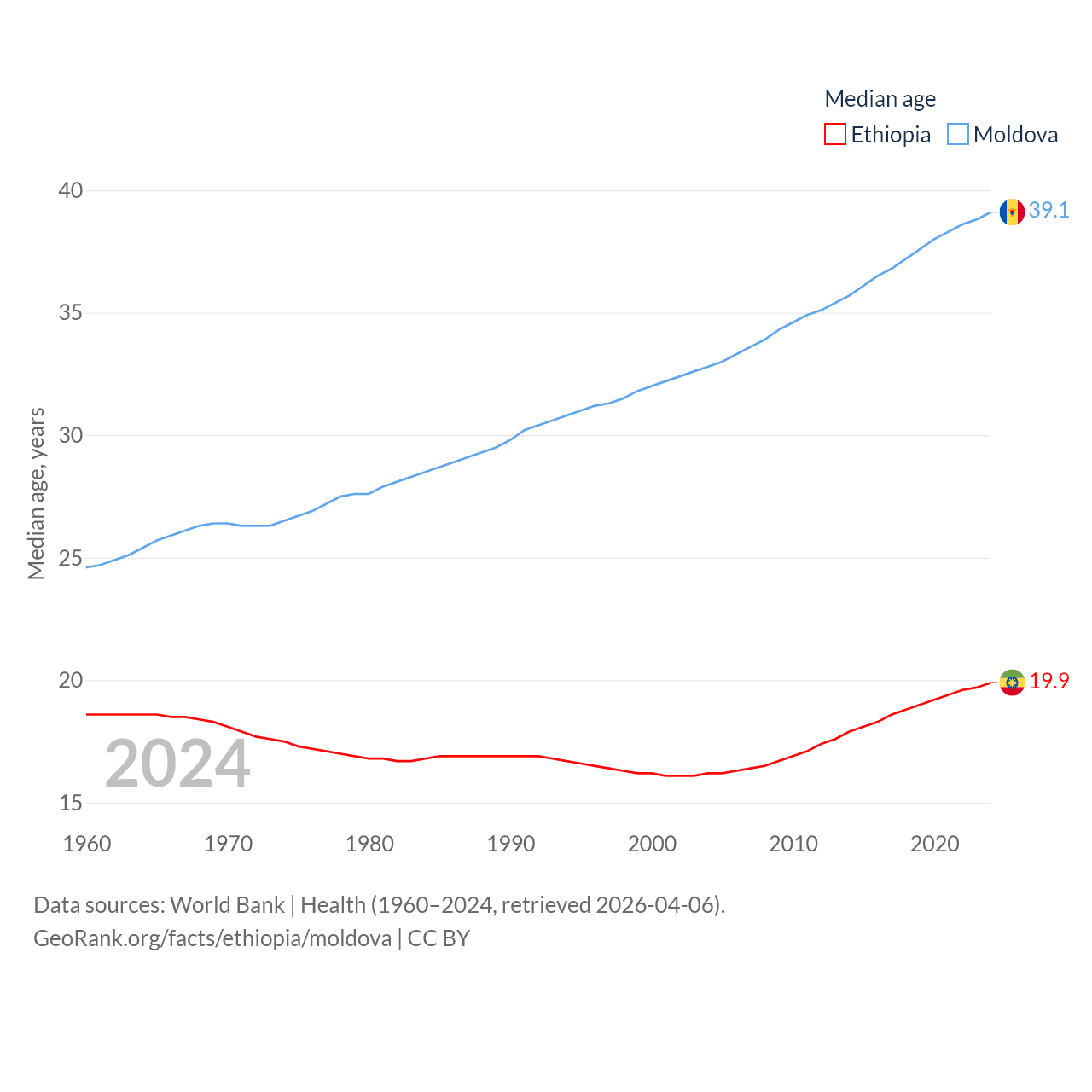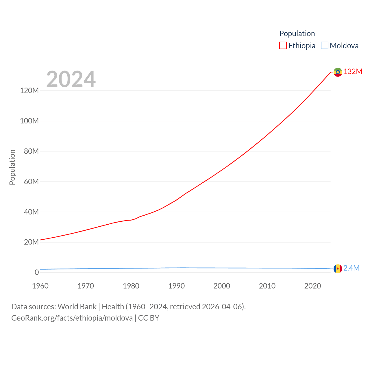 Ethiopia has a population of 132M (ranked 10/197), compared with 2.4M in Moldova (ranked 143/197). Ethiopia's land area is 435,716 sq mi versus 12,714 sq mi for Moldova (ranked 25th vs. 135th).