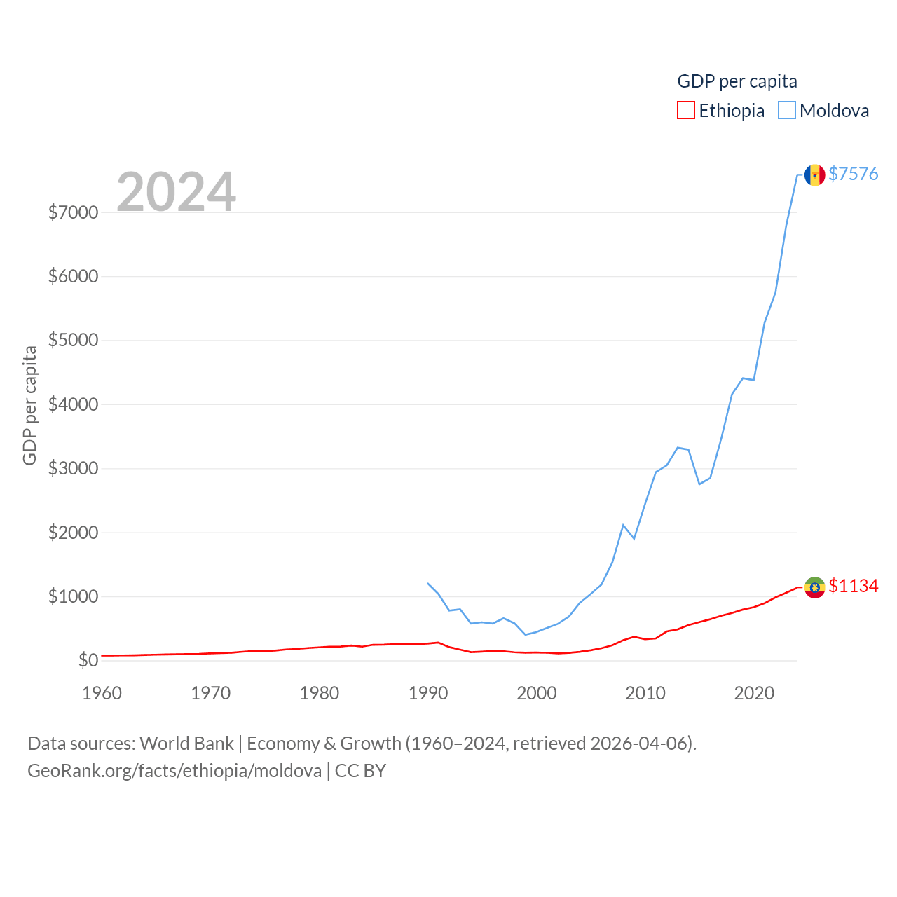 By GDP, Ethiopia ranks 60/197 ($150B) and Moldova ranks 134/197 ($18.2B). By GDP per capita, Ethiopia ranks 171/197 ($1,134), while Moldova ranks 99/197 ($7,576).