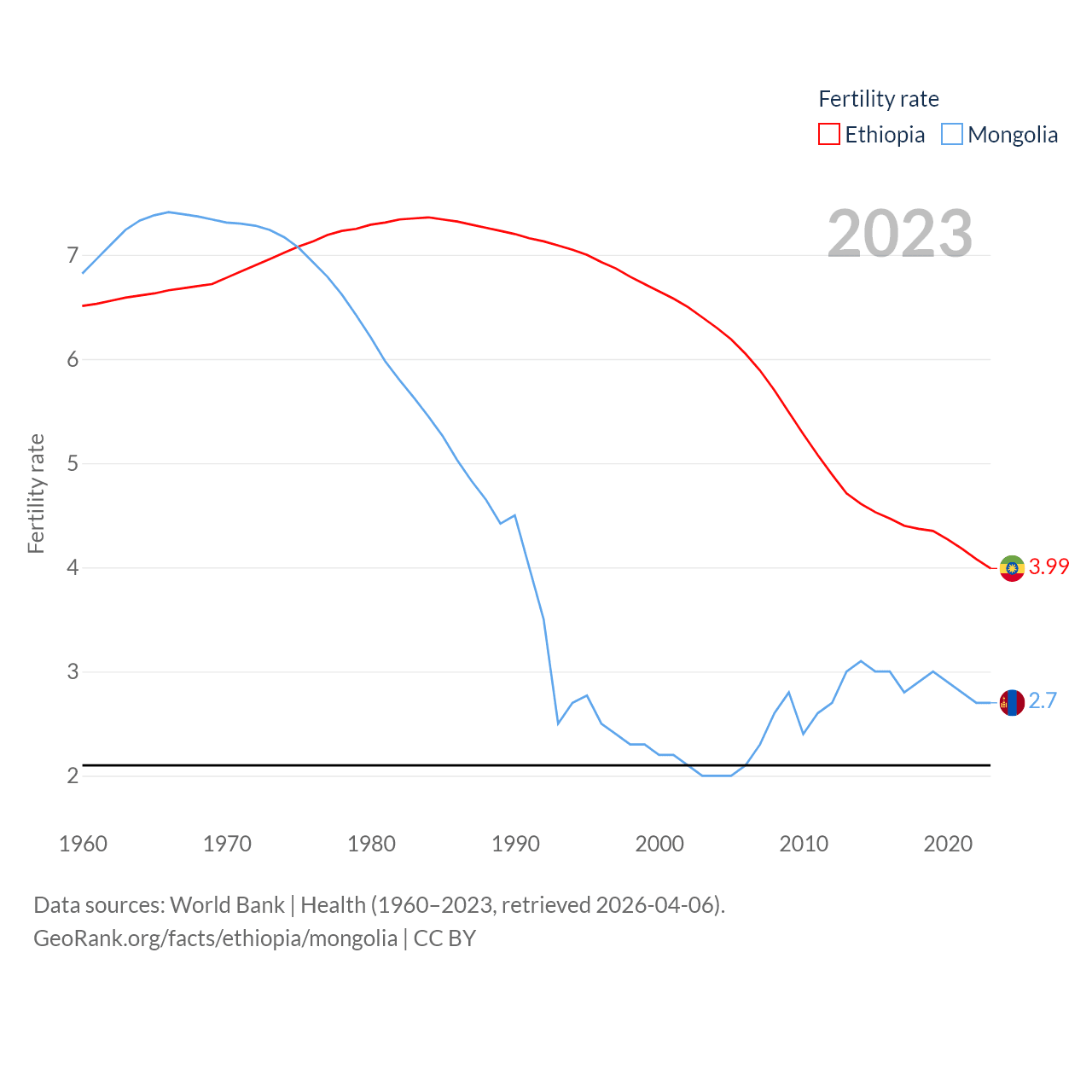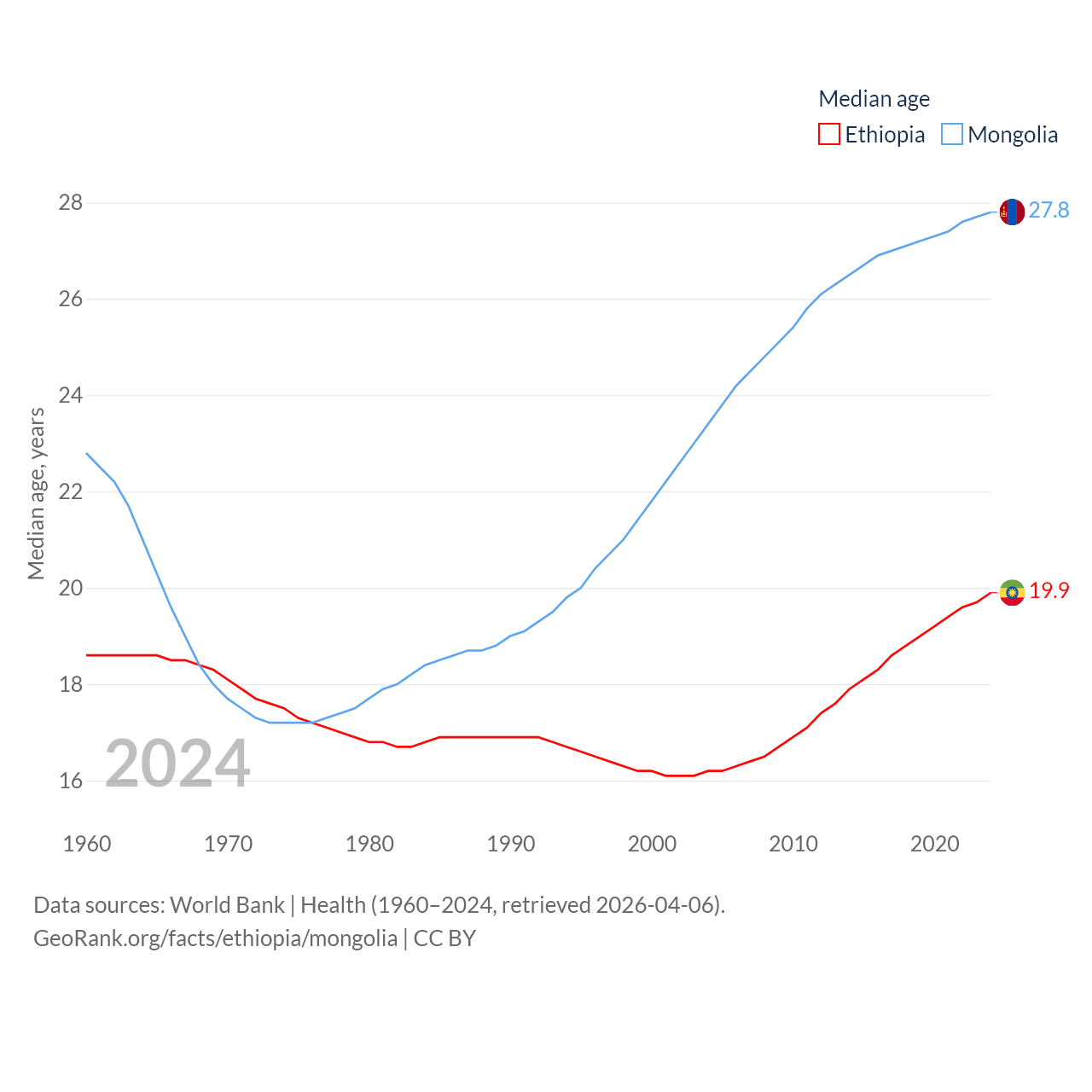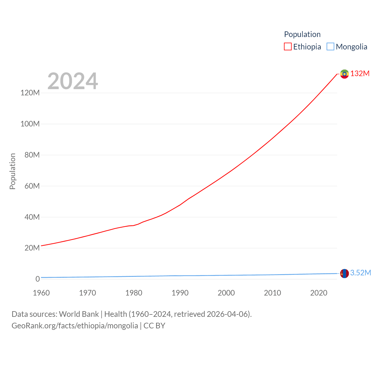 Ethiopia has a population of 132M (ranked 10/197), compared with 3.52M in Mongolia (ranked 132/197). Ethiopia's land area is 435,716 sq mi versus 601,740 sq mi for Mongolia (ranked 25th vs. 18th).