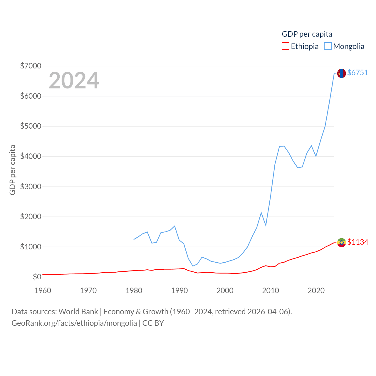 By GDP, Ethiopia ranks 60/197 ($150B) and Mongolia ranks 121/197 ($23.8B). By GDP per capita, Ethiopia ranks 171/197 ($1,134), while Mongolia ranks 105/197 ($6,751).