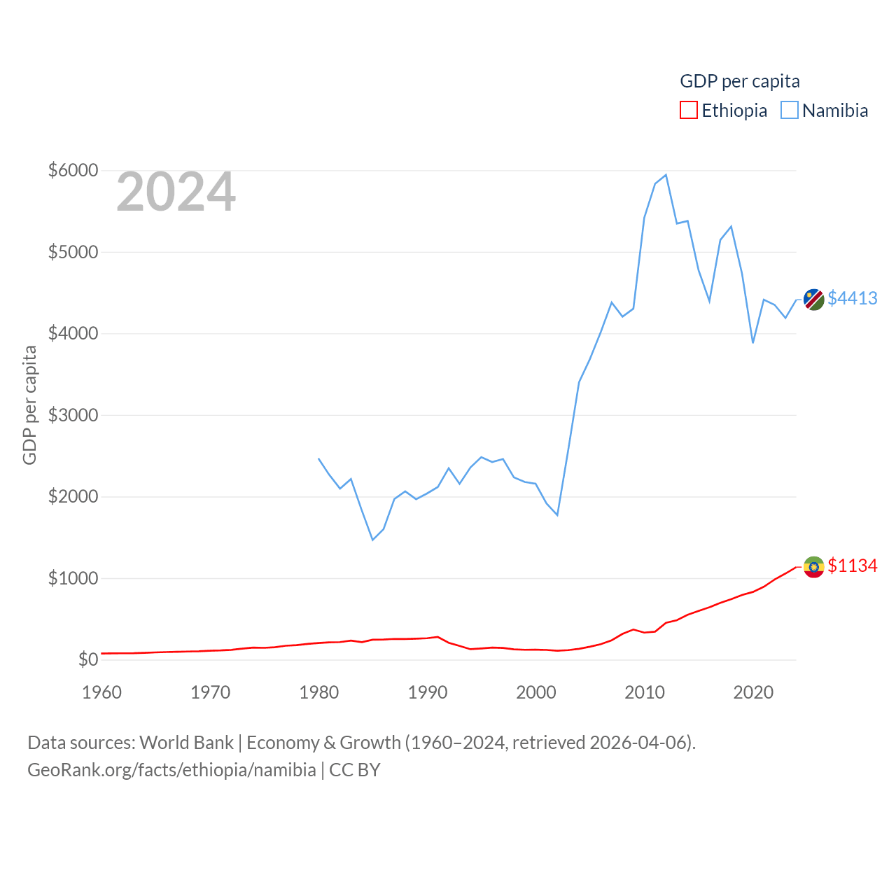 By GDP, Ethiopia ranks 60/197 ($150B) and Namibia ranks 147/197 ($13.4B). By GDP per capita, Ethiopia ranks 171/197 ($1,134), while Namibia ranks 126/197 ($4,413).