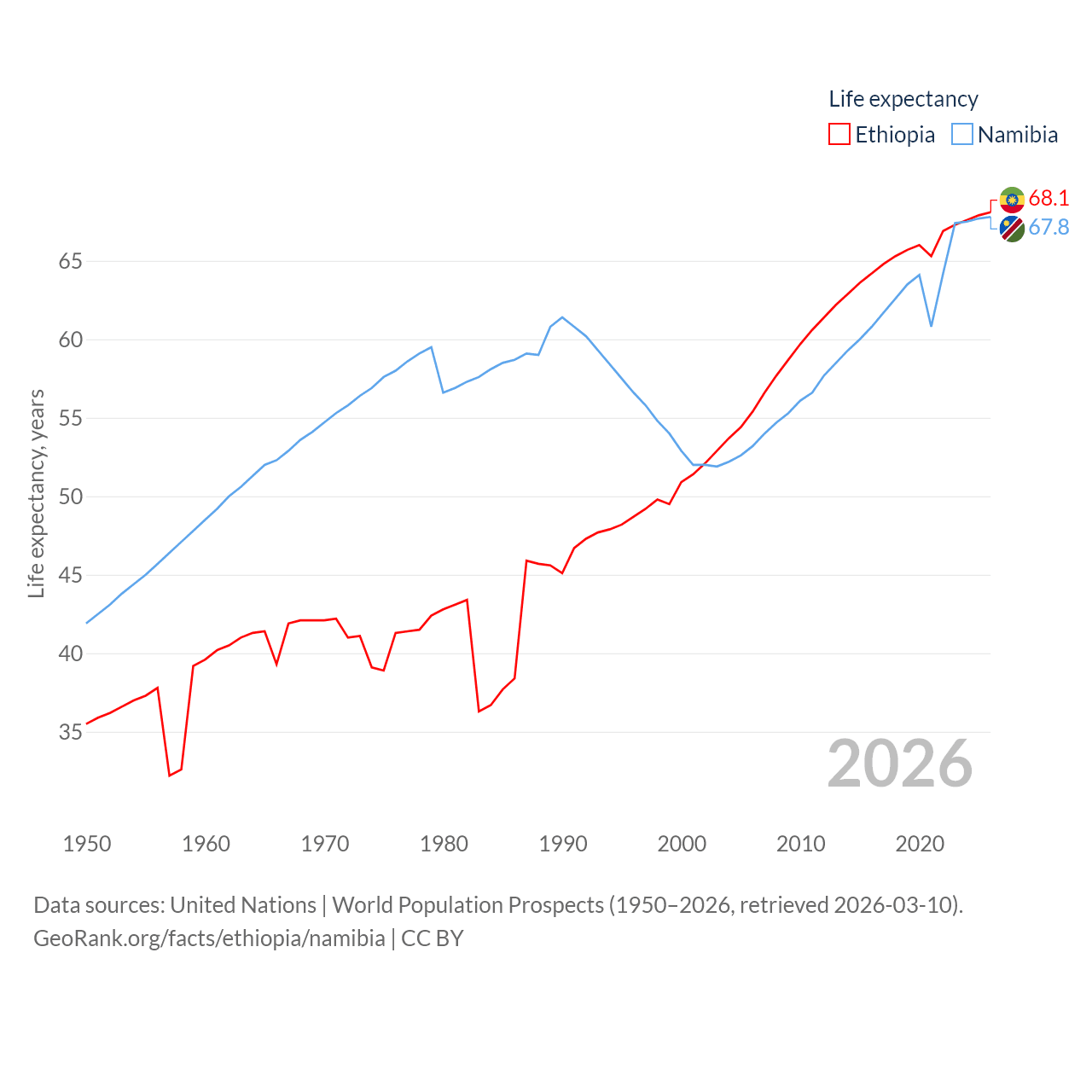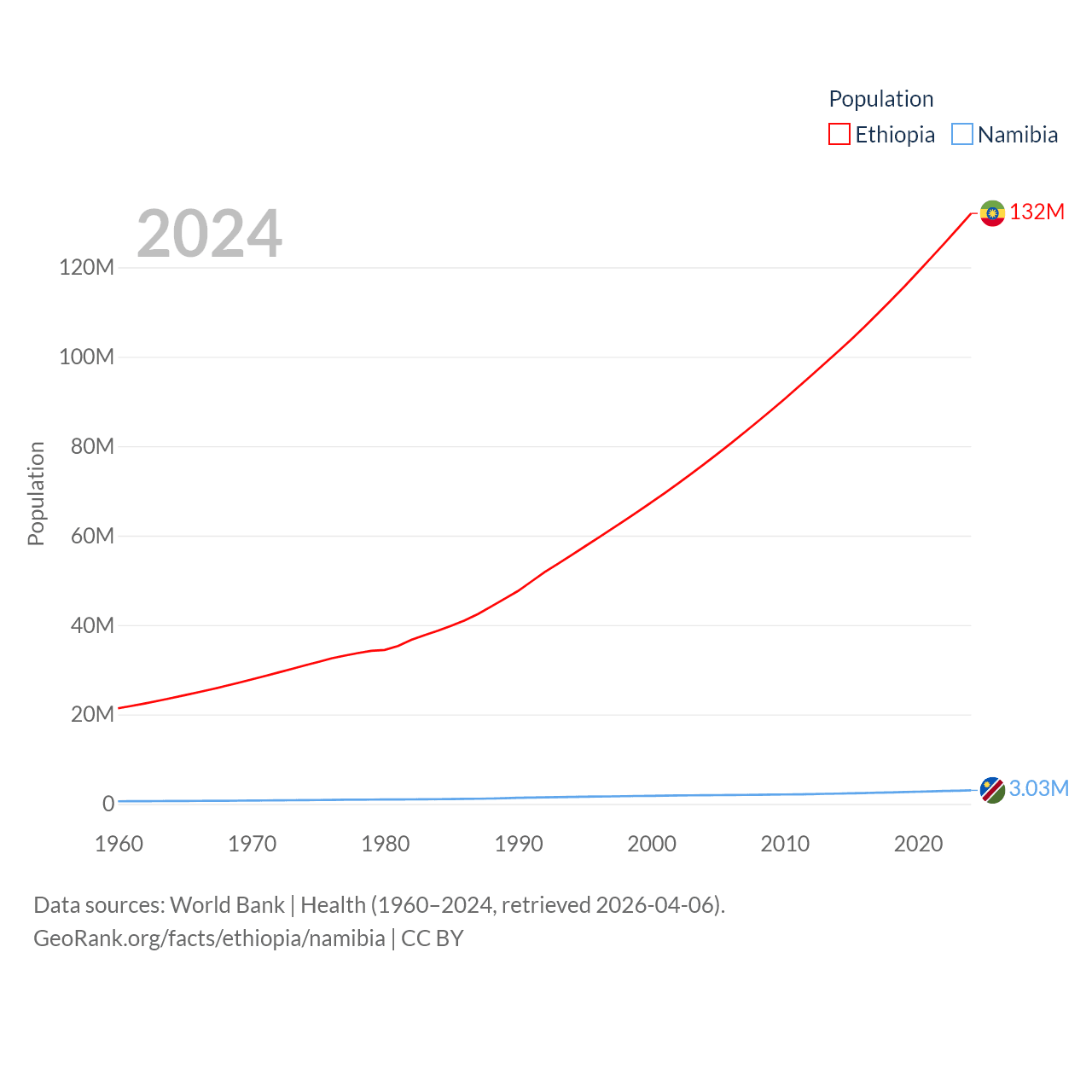 Ethiopia has a population of 132M (ranked 10/197), compared with 3.03M in Namibia (ranked 136/197). Ethiopia's land area is 435,716 sq mi versus 317,874 sq mi for Namibia (ranked 25th vs. 33rd).
