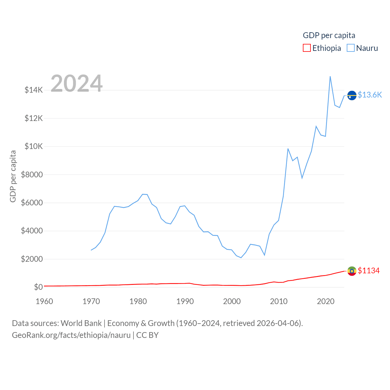 By GDP, Ethiopia ranks 60/197 ($150B) and Nauru ranks 195/197 ($163M). By GDP per capita, Ethiopia ranks 171/197 ($1,134), while Nauru ranks 74/197 ($13,609).