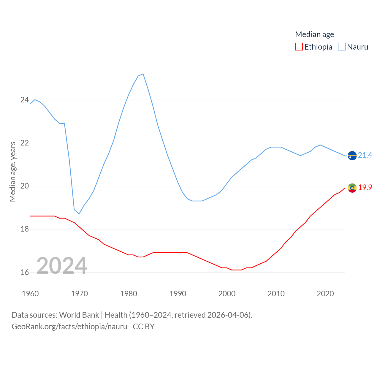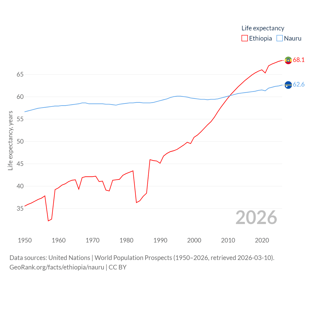 Ethiopia has a population of 132M (ranked 10/197), compared with 11.9K in Nauru (ranked 195/197). Ethiopia's land area is 435,716 sq mi versus 7.72 sq mi for Nauru (ranked 25th vs. 195th).