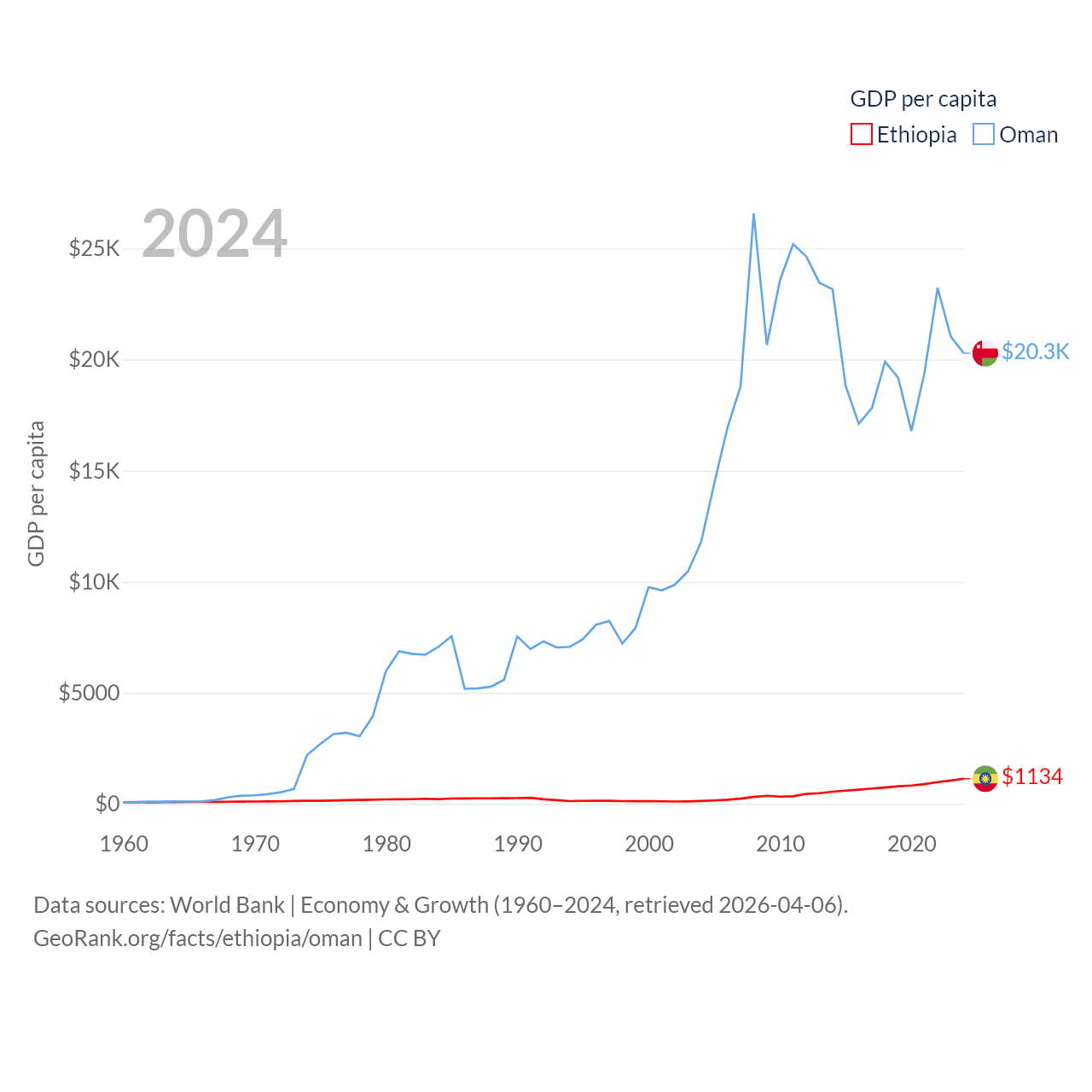 By GDP, Ethiopia ranks 60/197 ($150B) and Oman ranks 70/197 ($107B). By GDP per capita, Ethiopia ranks 171/197 ($1,134), while Oman ranks 57/197 ($20,285).