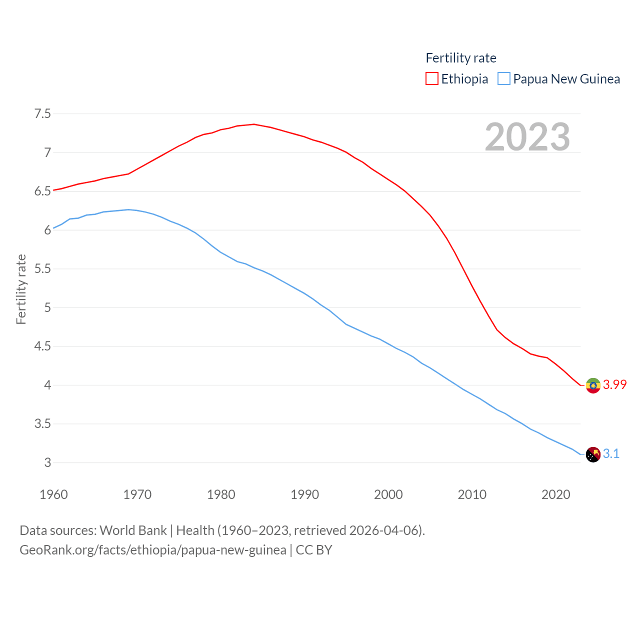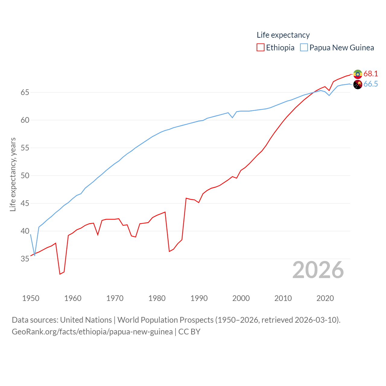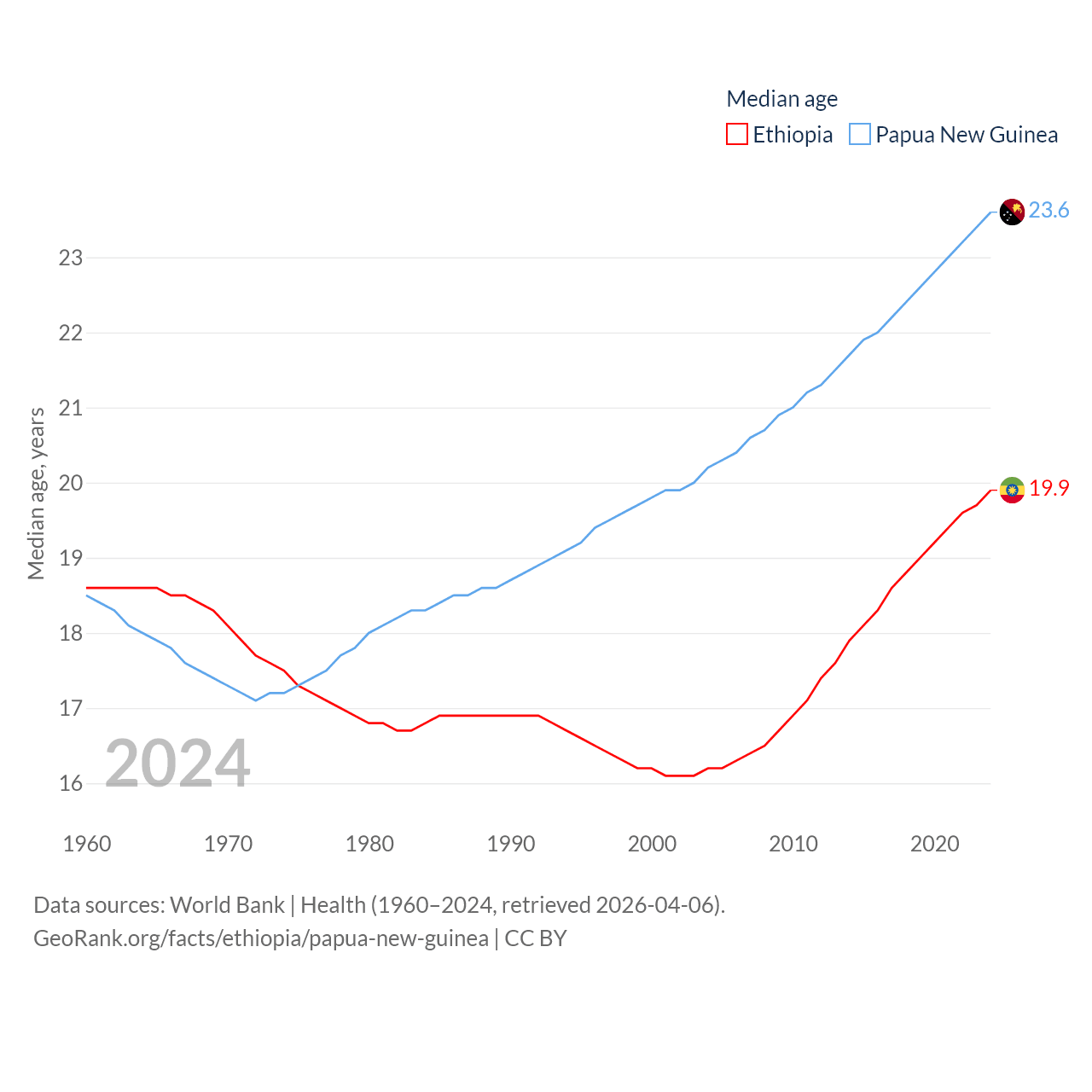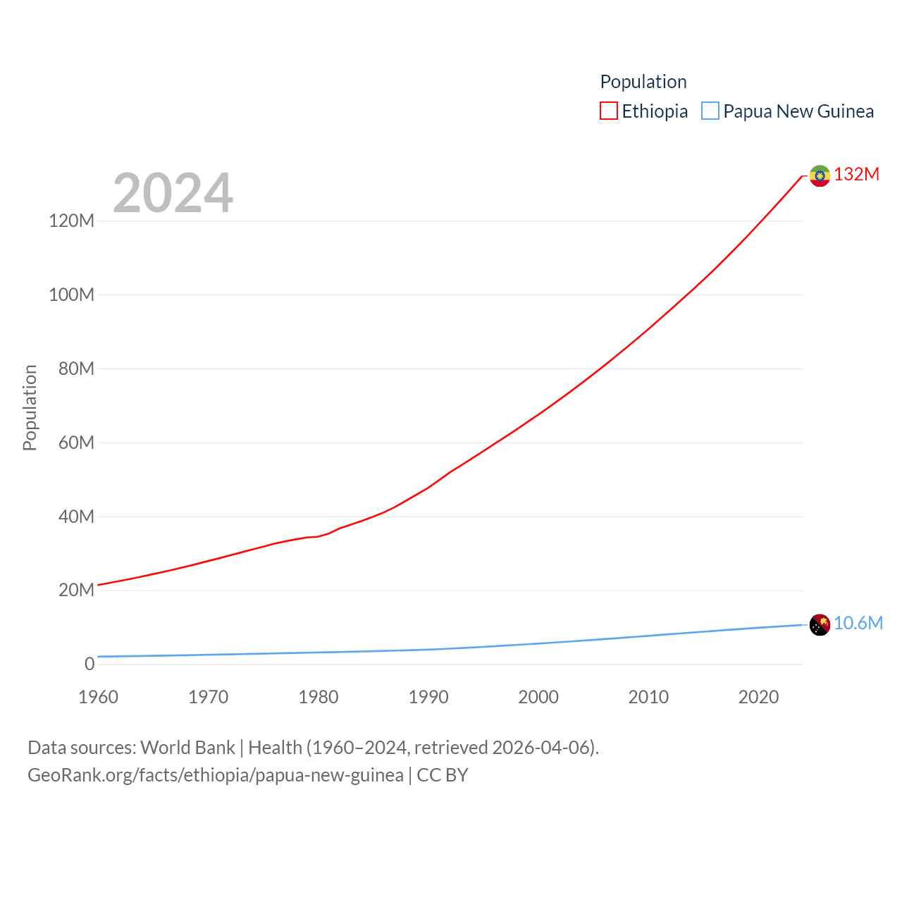 Ethiopia has a population of 132M (ranked 10/197), compared with 10.6M in Papua New Guinea (ranked 92/197). Ethiopia's land area is 435,716 sq mi versus 174,850 sq mi for Papua New Guinea (ranked 25th vs. 54th).