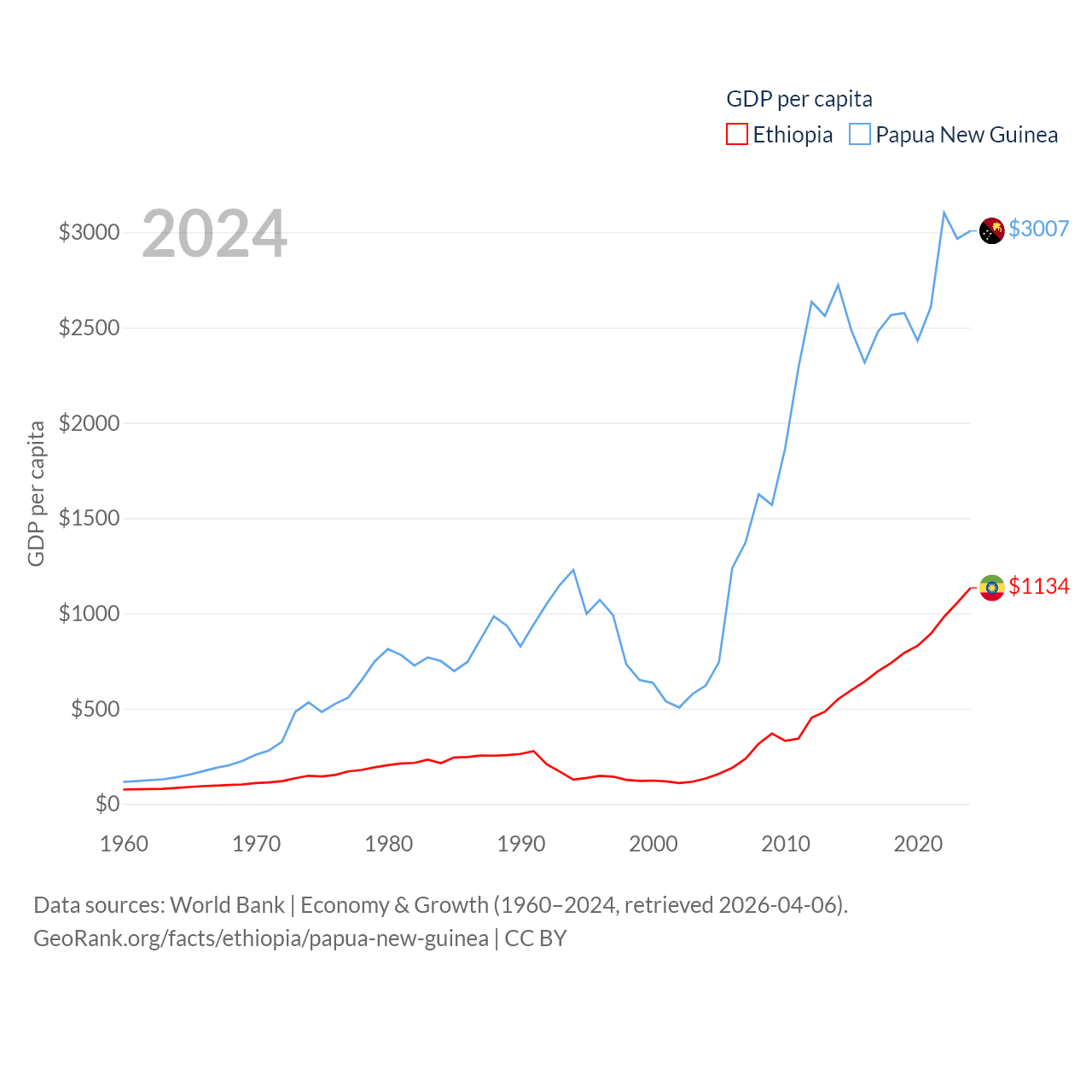 By GDP, Ethiopia ranks 60/197 ($150B) and Papua New Guinea ranks 110/197 ($31.8B). By GDP per capita, Ethiopia ranks 171/197 ($1,134), while Papua New Guinea ranks 140/197 ($3,007).