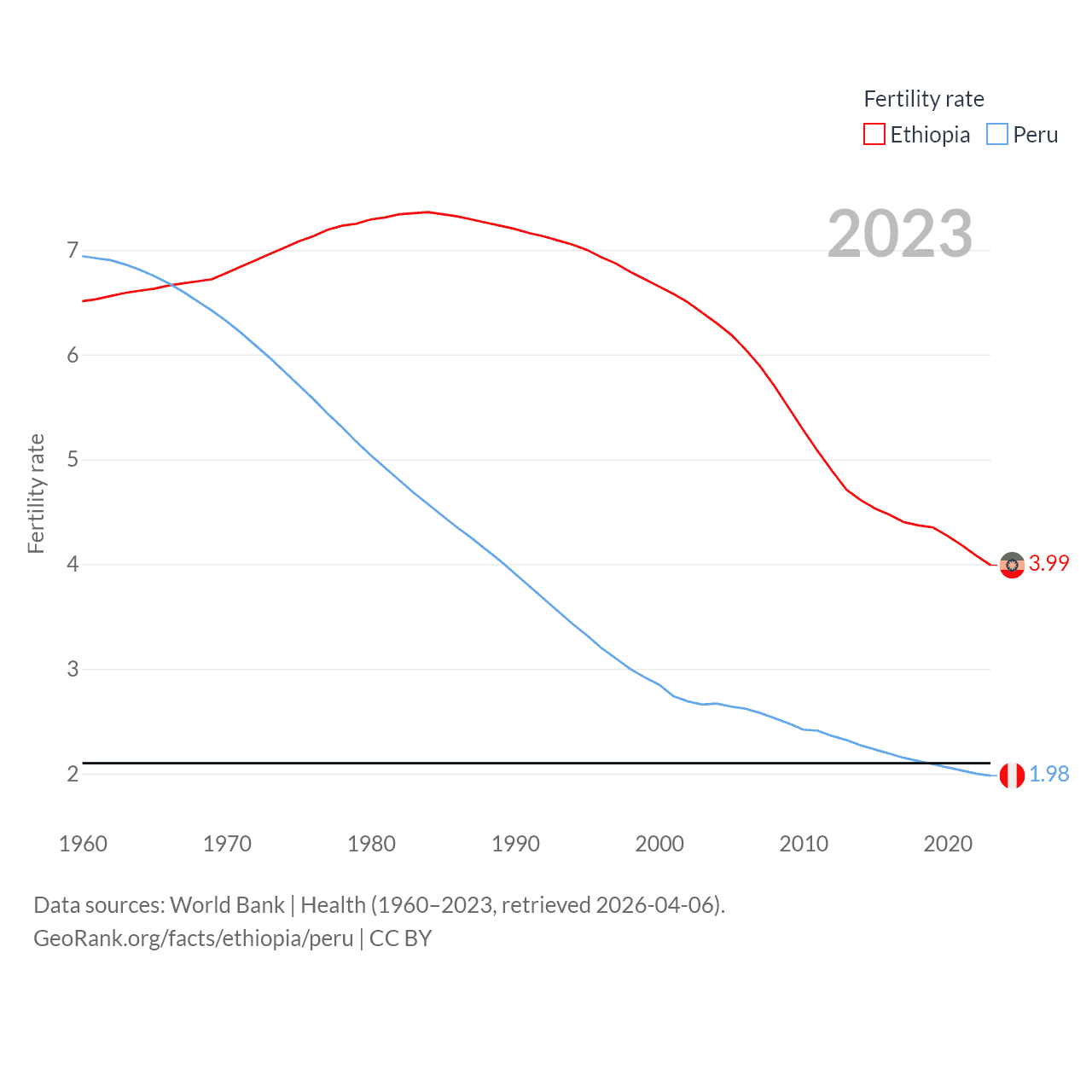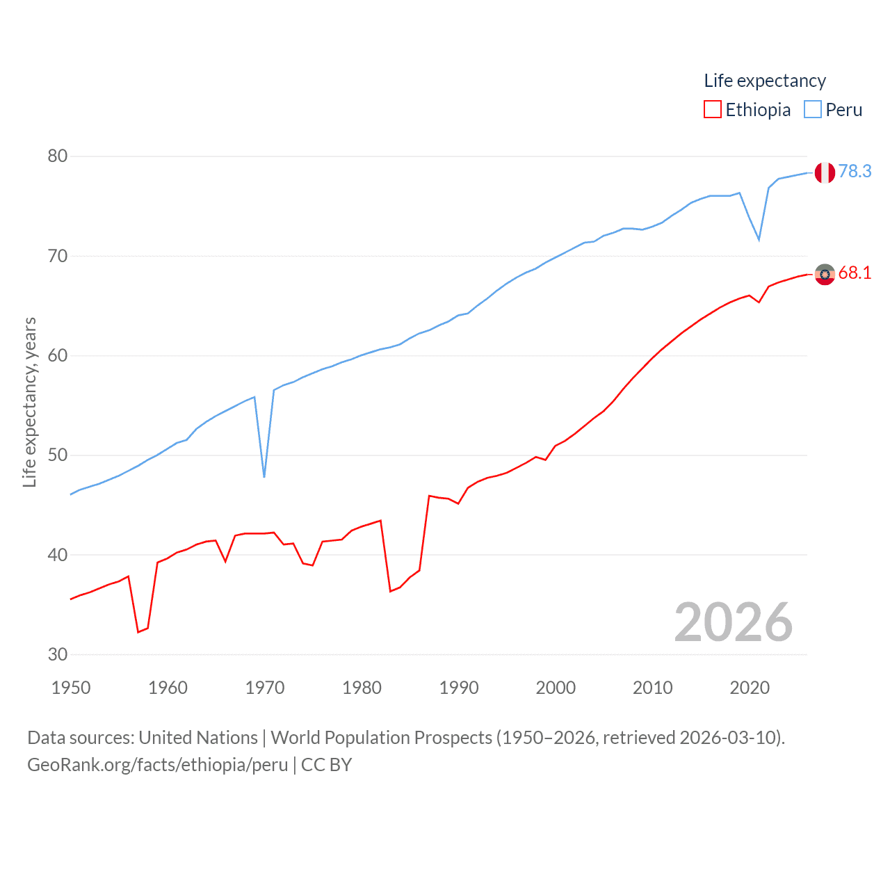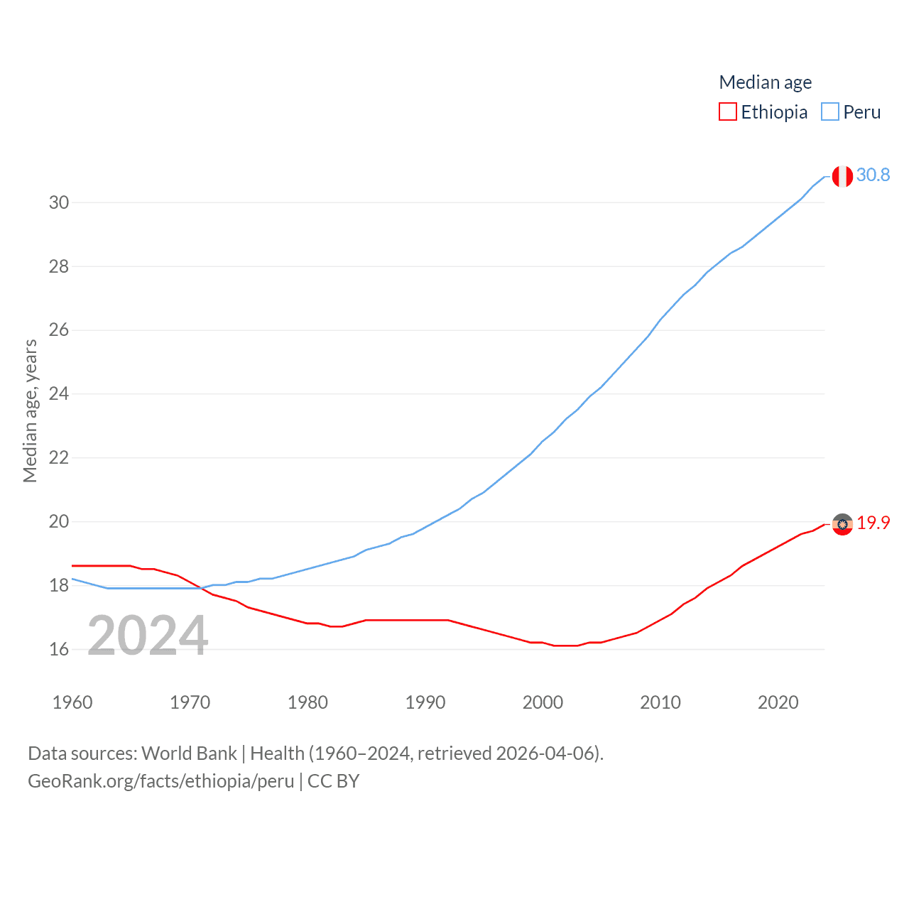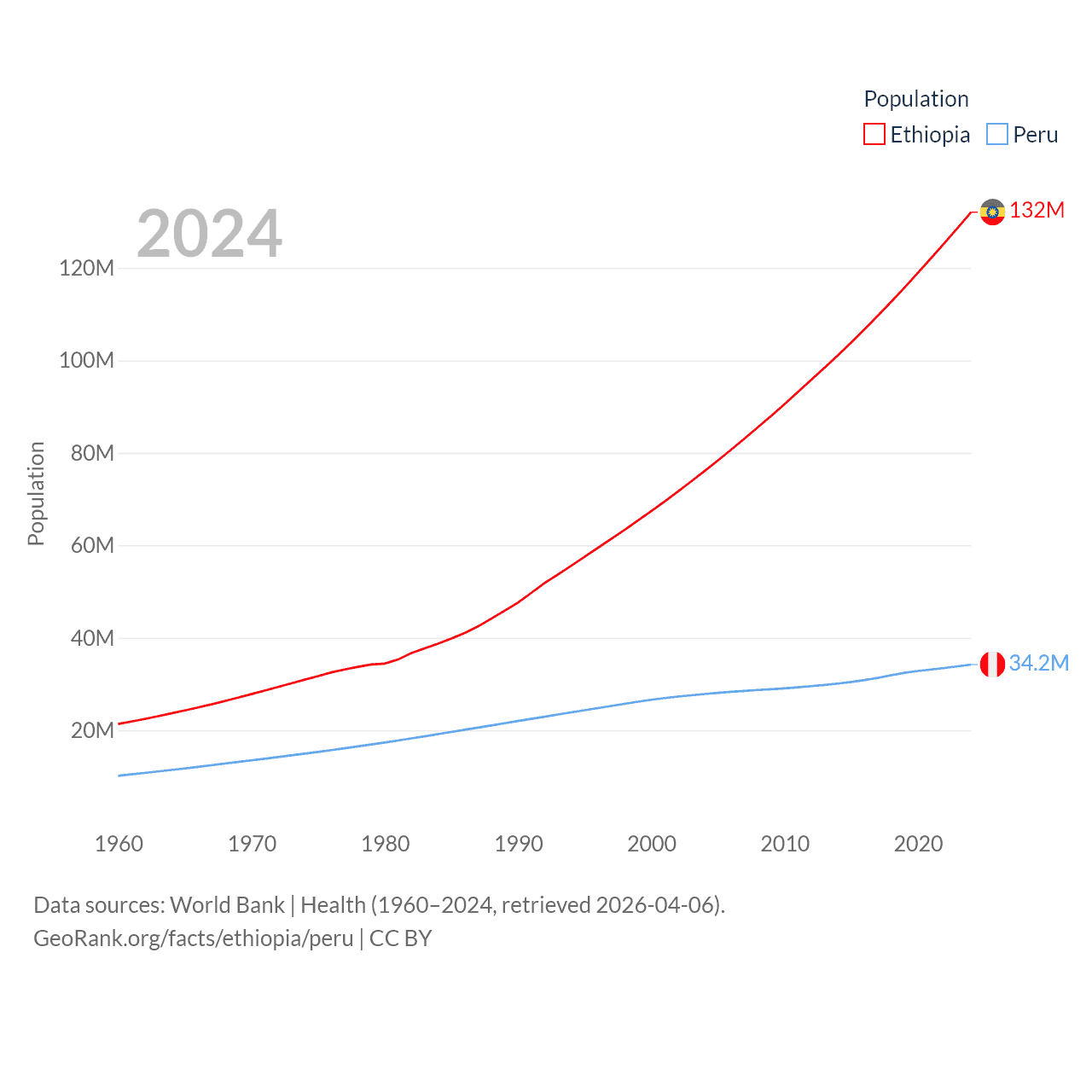 Ethiopia has a population of 132M (ranked 10/197), compared with 34.2M in Peru (ranked 48/197). Ethiopia's land area is 435,716 sq mi versus 494,211 sq mi for Peru (ranked 25th vs. 19th).