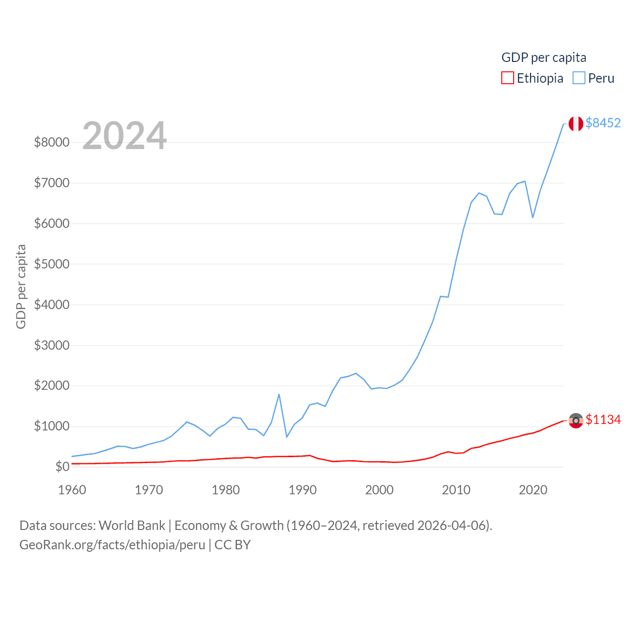 By GDP, Ethiopia ranks 60/197 ($150B) and Peru ranks 49/197 ($289B). By GDP per capita, Ethiopia ranks 171/197 ($1,134), while Peru ranks 91/197 ($8,452).