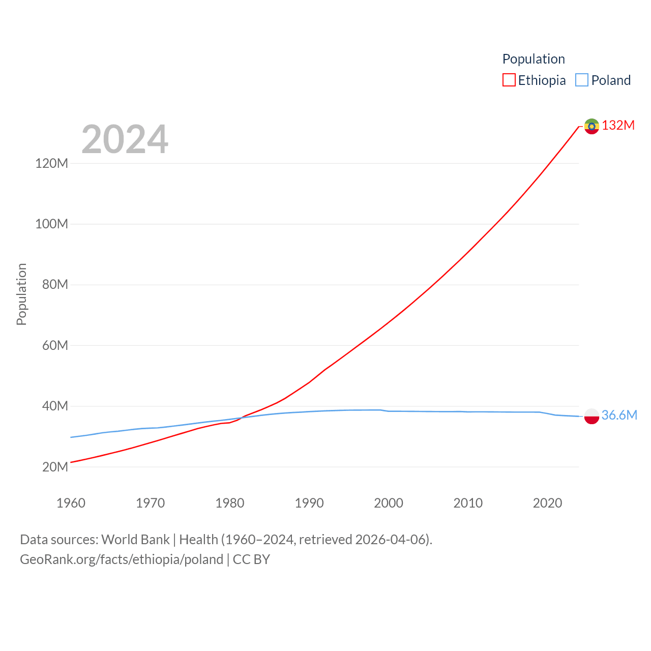 Ethiopia has a population of 132M (ranked 10/197), compared with 36.6M in Poland (ranked 42/197). Ethiopia's land area is 435,716 sq mi versus 118,252 sq mi for Poland (ranked 25th vs. 69th).