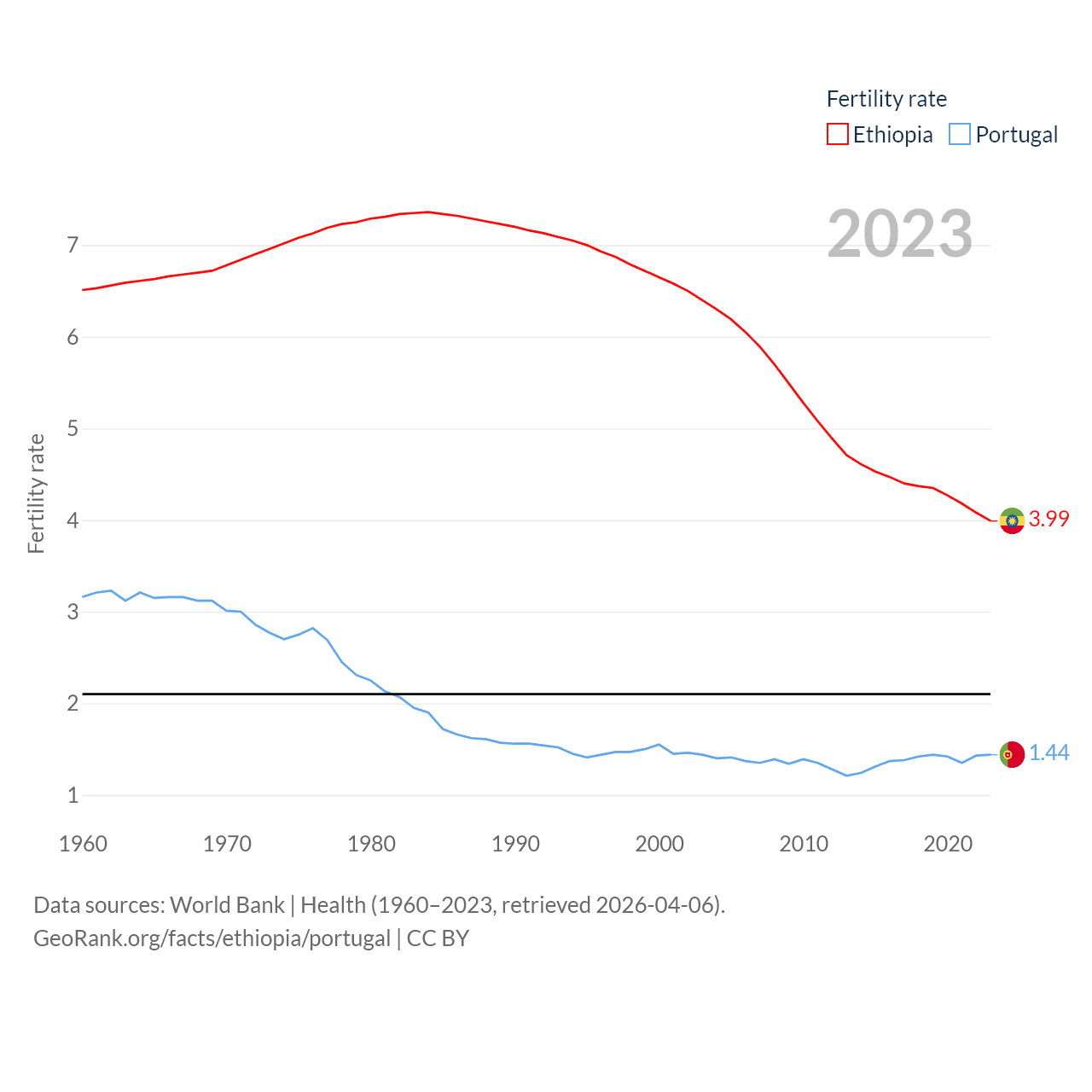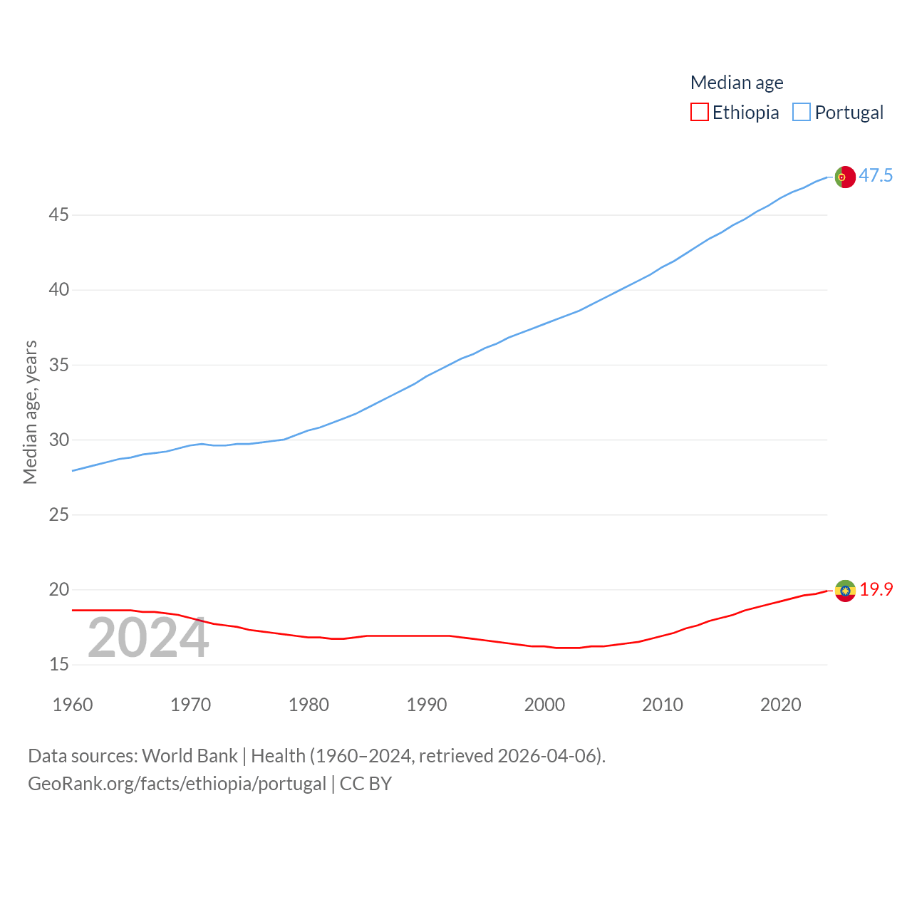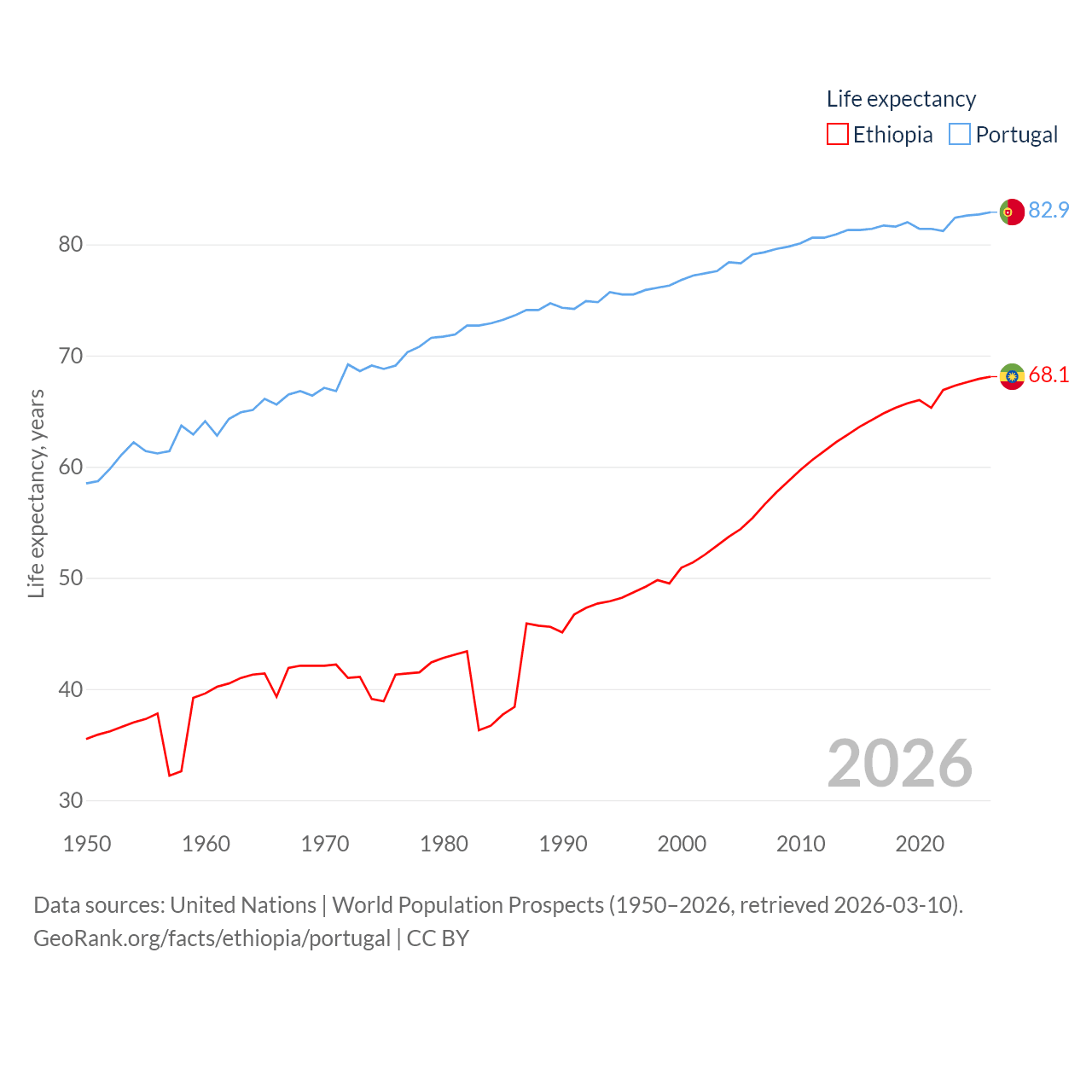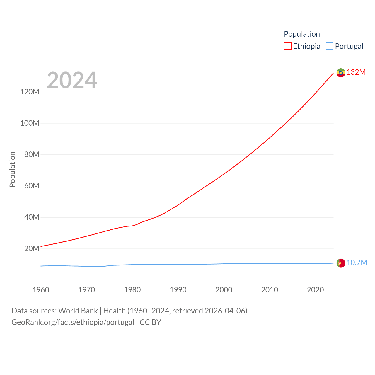 Ethiopia has a population of 132M (ranked 10/197), compared with 10.7M in Portugal (ranked 90/197). Ethiopia's land area is 435,716 sq mi versus 35,369 sq mi for Portugal (ranked 25th vs. 108th).