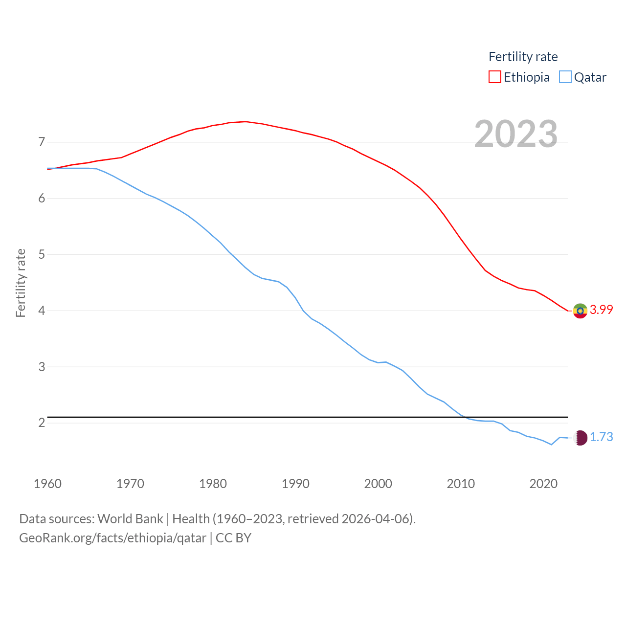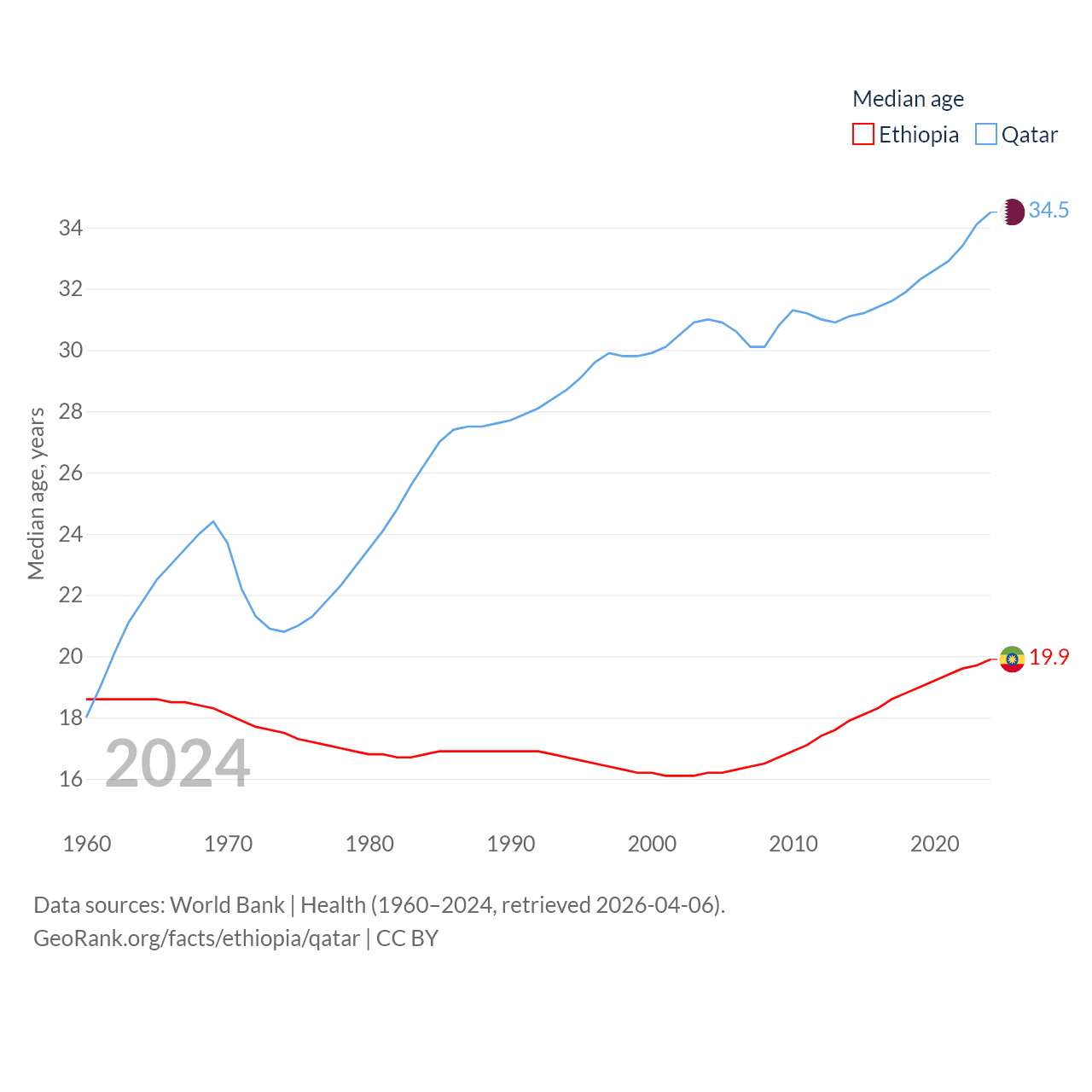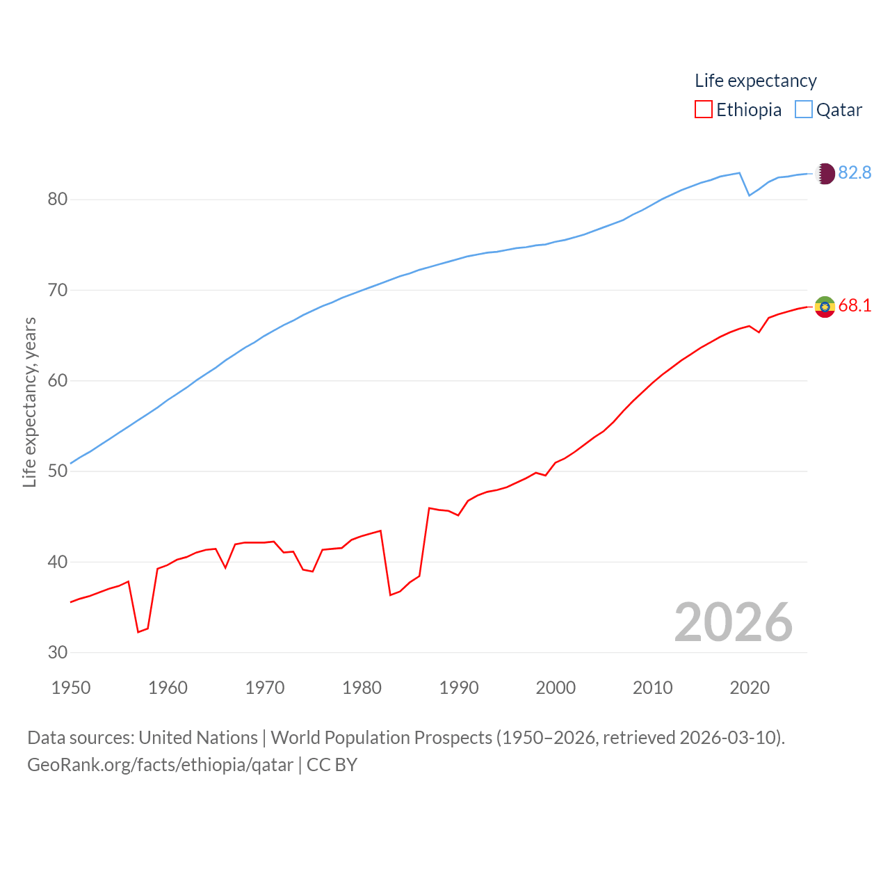 Ethiopia has a population of 132M (ranked 10/197), compared with 2.86M in Qatar (ranked 138/197). Ethiopia's land area is 435,716 sq mi versus 4,436 sq mi for Qatar (ranked 25th vs. 158th).