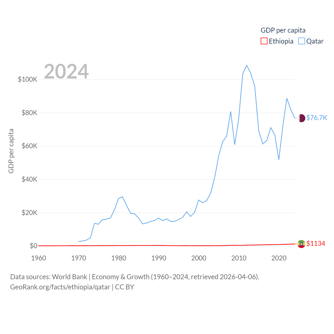 By GDP, Ethiopia ranks 60/197 ($150B) and Qatar ranks 56/197 ($219B). By GDP per capita, Ethiopia ranks 171/197 ($1,134), while Qatar ranks 11/197 ($76,689).