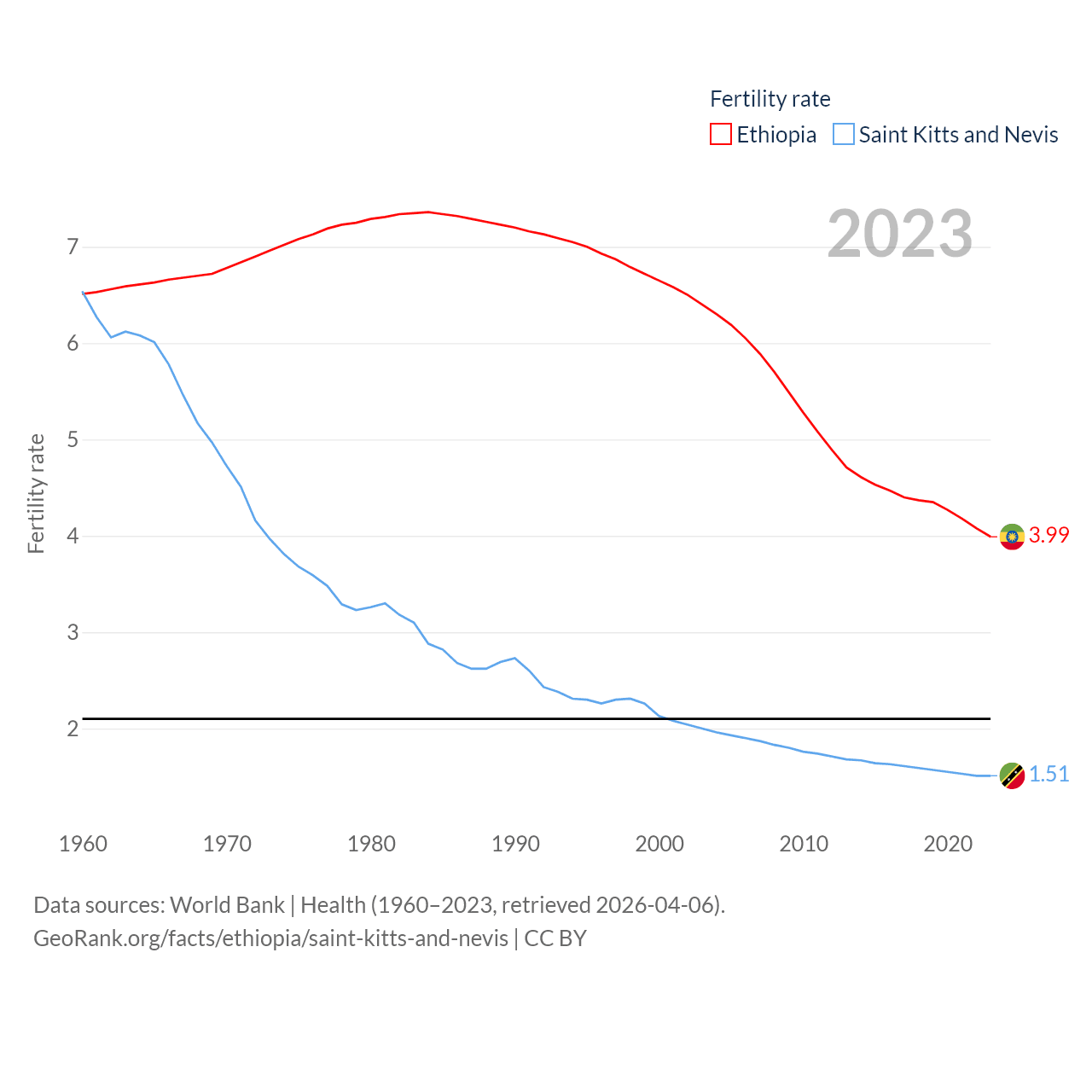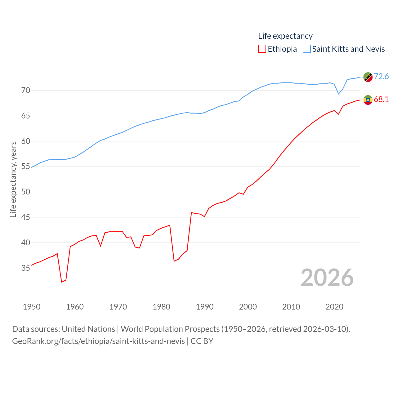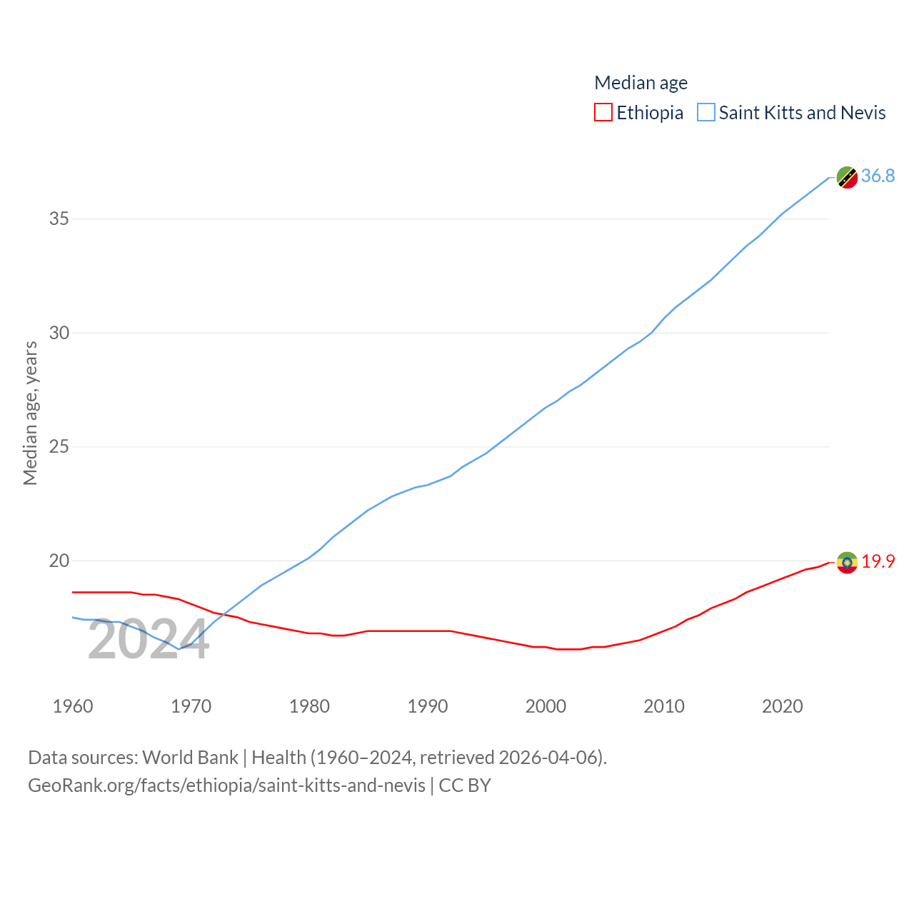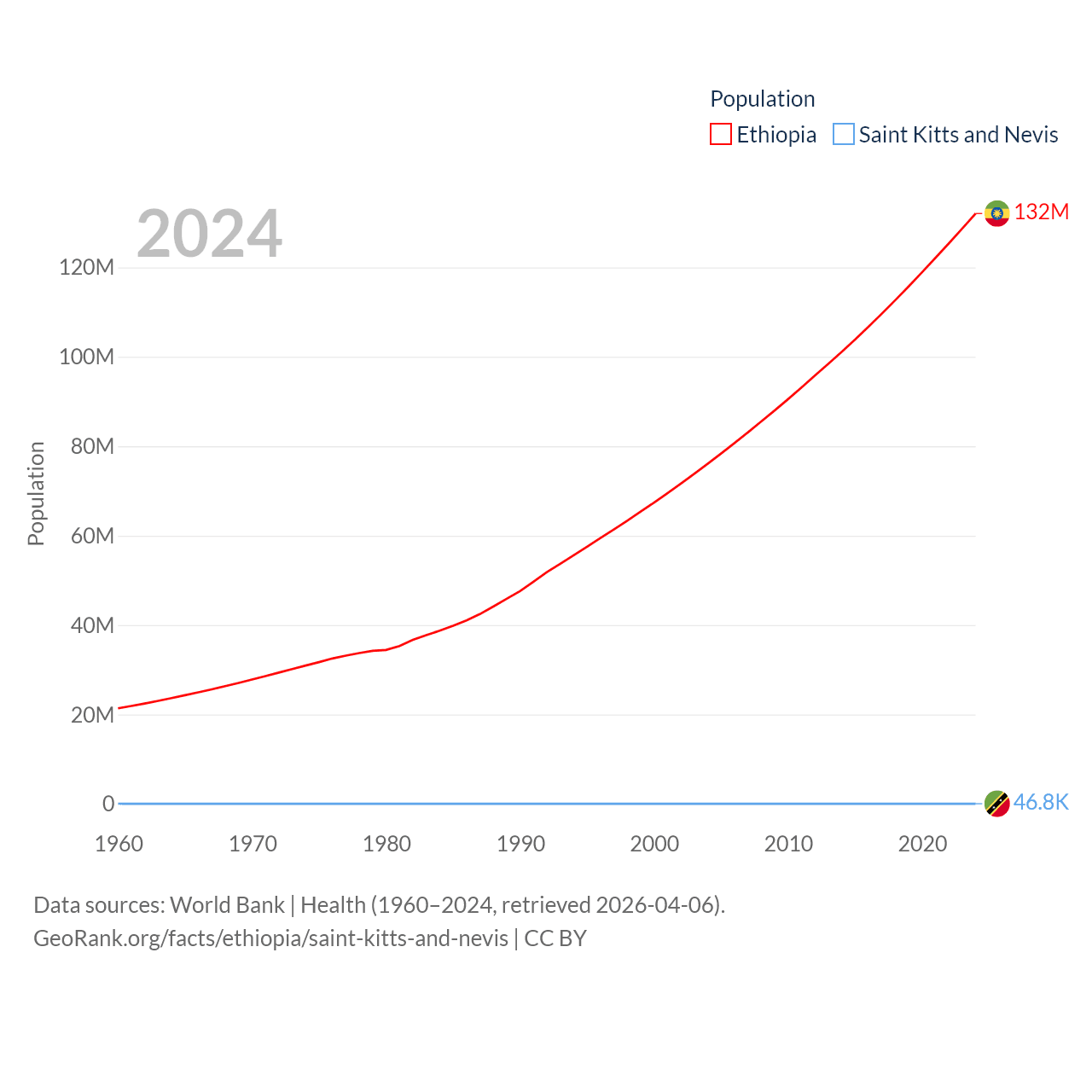 Ethiopia has a population of 132M (ranked 10/197), compared with 46.8K in Saint Kitts and Nevis (ranked 189/197). Ethiopia's land area is 435,716 sq mi versus 100.4 sq mi for Saint Kitts and Nevis (ranked 25th vs. 189th).