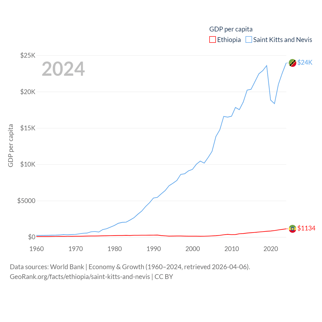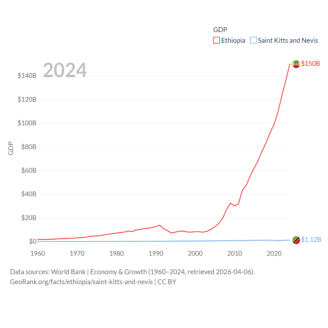 By GDP, Ethiopia ranks 60/197 ($150B) and Saint Kitts and Nevis ranks 187/197 ($1.12B). By GDP per capita, Ethiopia ranks 171/197 ($1,134), while Saint Kitts and Nevis ranks 51/197 ($23,961).